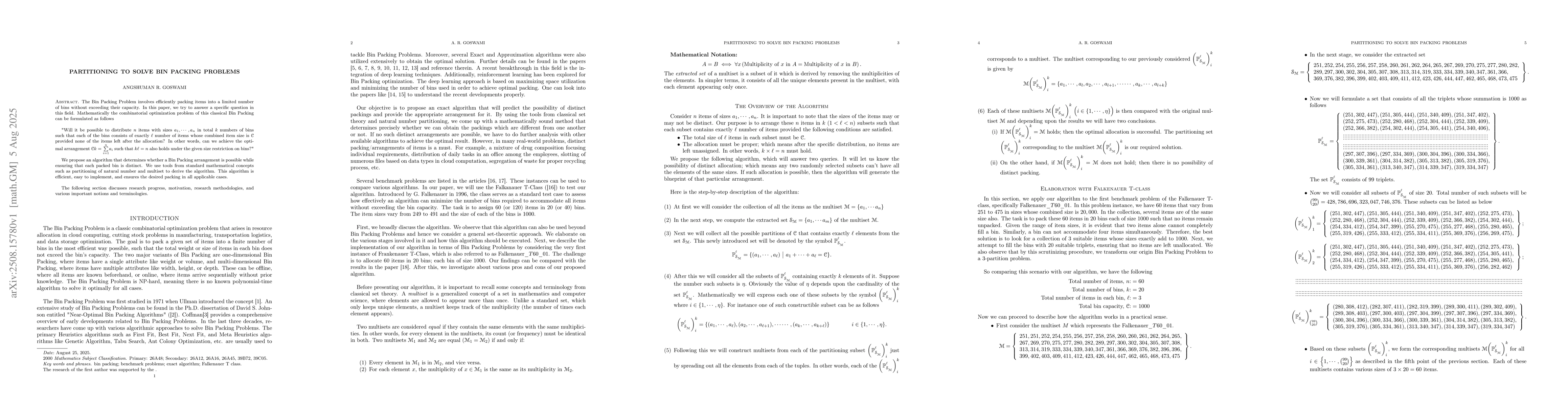 The Bin Packing Problem involves efficiently packing items into a limited number of bins without exceeding their capacity. In this paper, we try to answer a specific question in this field. Mathematically the combinatorial optimization problem of this classical Bin Packing can be formulated as follows "Will it be possible to distribute $n$ items with sizes $a_1, \cdots ,a_n$ in total $k$ numbers of bins such that each of the bins consists of exactly $\ell$ number of items whose combined item size is $\mathbb{C}$ provided none of the items left after the allocation? In other words, can we achieve the optimal arrangement $\mathbb{C} =\sum_{i=1}^{n} a_i$ such that $k\ell=n$ also holds under the given size restriction on bins?" We propose an algorithm that determines whether a Bin Packing arrangement is possible while ensuring that each packed bin is distinct. We use tools from standard mathematical concepts such as partitioning of natural number and multiset to derive the algorithm. This algorithm is efficient, easy to implement, and ensures the desired packing in all applicable cases.