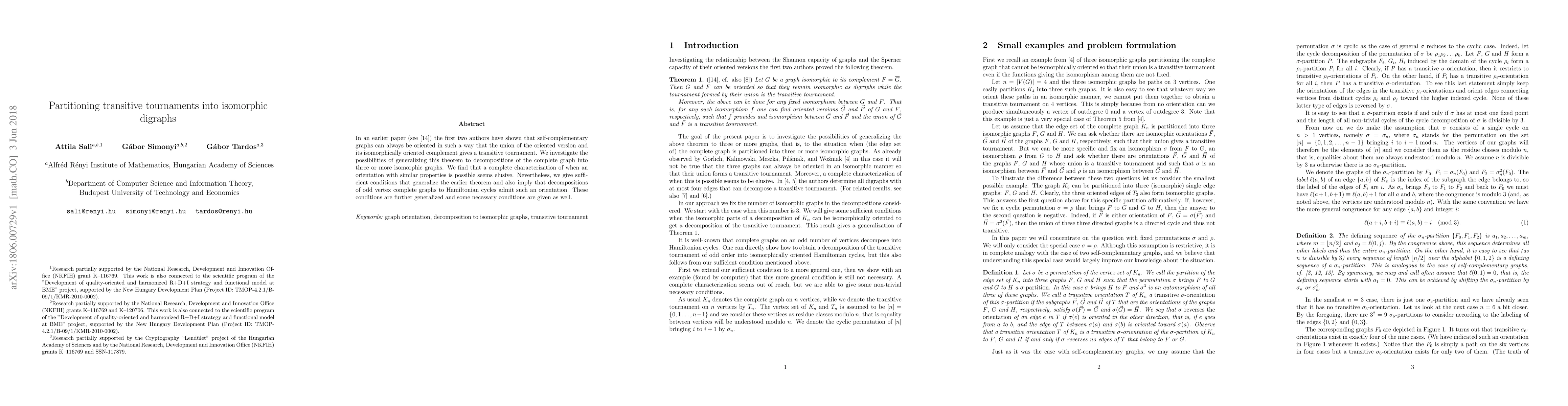 In an earlier paper the first two authors have shown that self-complementary graphs can always be oriented in such a way that the union of the oriented version and its isomorphically oriented complement gives a transitive tournament. We investigate the possibilities of generalizing this theorem to decompositions of the complete graph into three or more isomorphic graphs. We find that a complete characterization of when an orientation with similar properties is possible seems elusive. Nevertheless, we give sufficient conditions that generalize the earlier theorem and also imply that decompositions of odd vertex complete graphs to Hamiltonian cycles admit such an orientation. These conditions are further generalized and some necessary conditions are given as well.