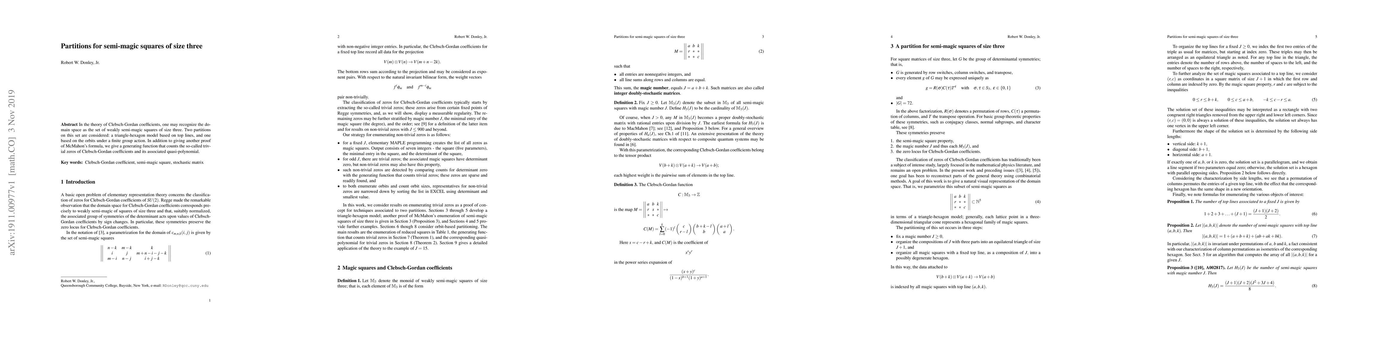 In the theory of Clebsch-Gordan coefficients, one may recognize the domain space as the set of weakly semi-magic squares of size three. Two partitions on this set are considered: a triangle-hexagon model based on top lines, and one based on the orbits under a finite group action. In addition to giving another proof of McMahon's formula, we give a generating function that counts the so-called trivial zeros of Clebsch-Gordan coefficients and its associated quasi-polynomial.