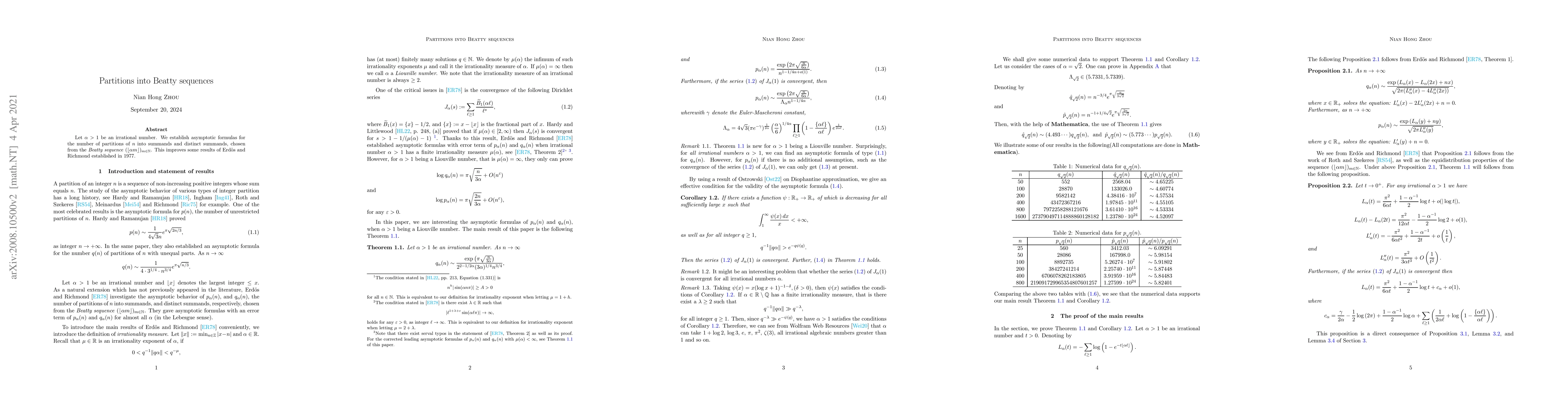 Let $\alpha>1$ be an irrational number. We establish asymptotic formulas for the number of partitions of $n$ into summands and distinct summands, chosen from the Beatty sequence $(\lfloor\alpha m\rfloor)_{m\in\mathbb{N}}$. This improves some results of Erd\"{o}s and Richmond established in 1977.