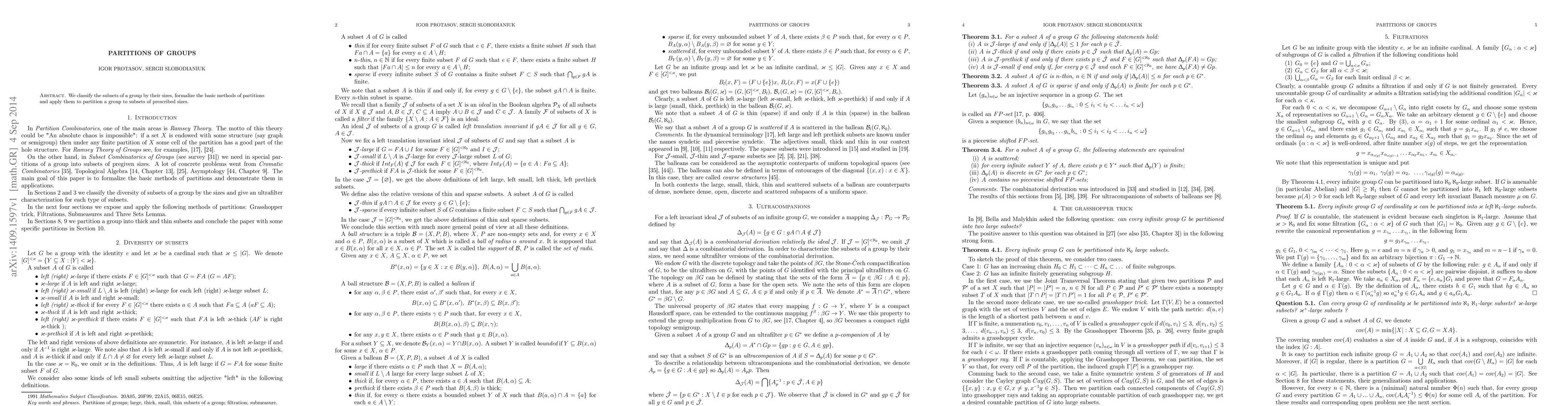 We classify the subsets of a group by their sizes, formalize the basic methods of partitions and apply them to partition a group to subsets of prescribed sizes.