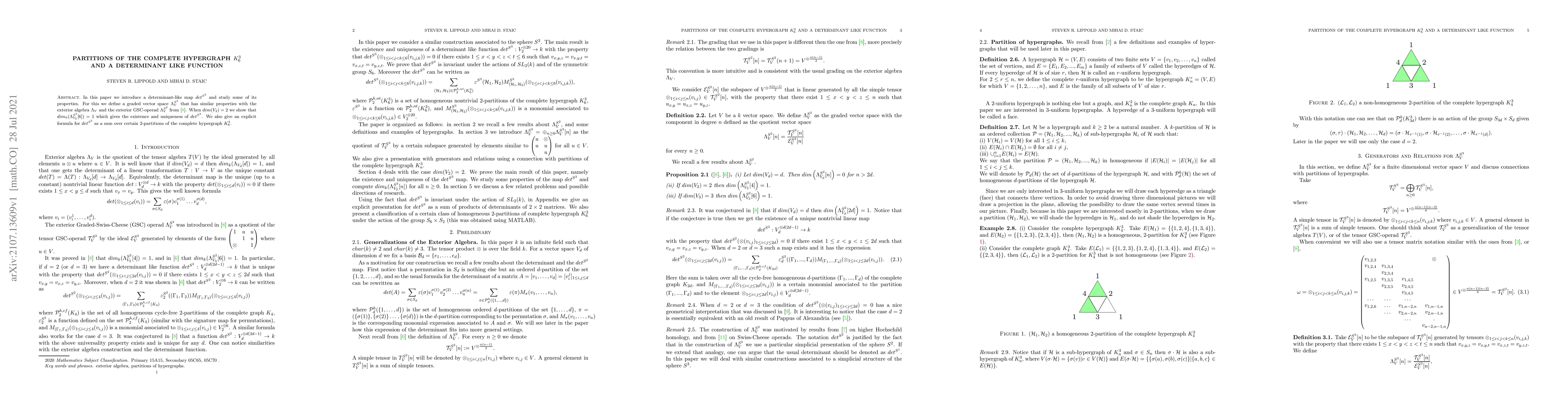 This paper introduces a determinant-like map $det^{S^3}$ and explores its properties, defining a graded vector space $\Lambda^{S^3}_V$ analogous to exterior algebras. It demonstrates the existence and uniqueness of $det^{S^3}$ when $dim(V_2)=2$ and provides an explicit formula for it as a sum over $2$-partitions of the complete hypergraph $K_6^3$.