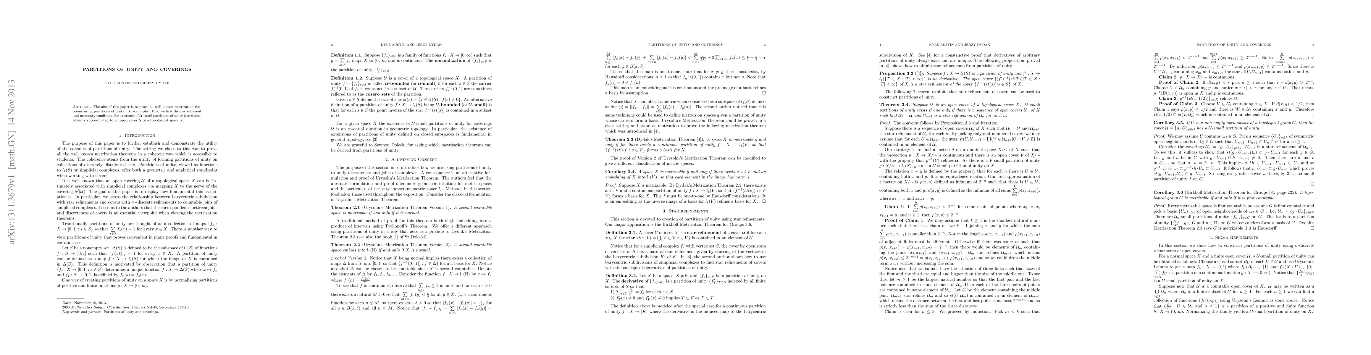 This paper proves well-known metrization theorems through the use of partitions of unity, focusing on establishing necessary and sufficient conditions for the existence of $\mathcal{U}$-small partitions of unity, which are subordinated to an open cover $\mathcal{U}$ of a topological space $X$.