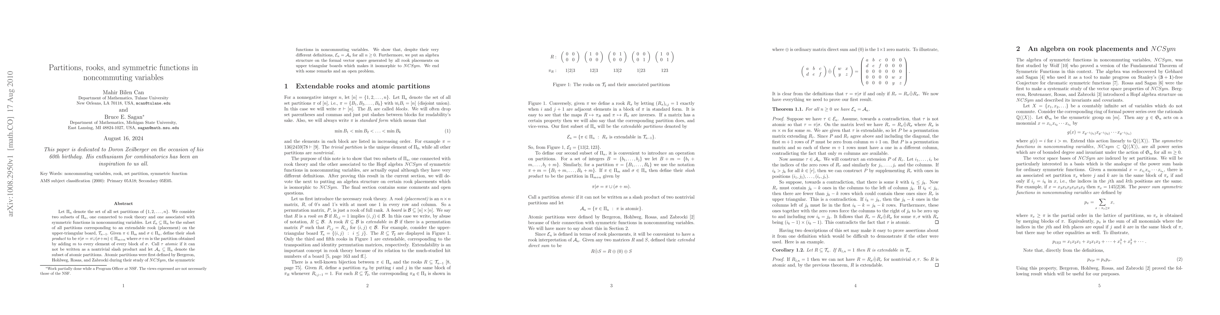 Let $\Pi_n$ denote the set of all set partitions of $\{1,2,\ldots,n\}$. We consider two subsets of $\Pi_n$, one connected to rook theory and one associated with symmetric functions in noncommuting variables. Let $\cE_n\sbe\Pi_n$ be the subset of all partitions corresponding to an extendable rook (placement) on the upper-triangular board, $\cT_{n-1}$. Given $\pi\in\Pi_m$ and $\si\in\Pi_n$, define their {\it slash product\/} to be $\pi|\si=\pi\cup(\si+m)\in\Pi_{m+n}$ where $\si+m$ is the partition obtained by adding $m$ to every element of every block of $\si$. Call $\tau$ {\it atomic\/} if it can not be written as a nontrivial slash product and let $\cA_n\sbe\Pi_n$ denote the subset of atomic partitions. Atomic partitions were first defined by Bergeron, Hohlweg, Rosas, and Zabrocki during their study of $NCSym$, the symmetric functions in noncommuting variables. We show that, despite their very different definitions, $\cE_n=\cA_n$ for all $n\ge0$. Furthermore, we put an algebra structure on the formal vector space generated by all rook placements on upper triangular boards which makes it isomorphic to $NCSym$. We end with some remarks and an open problem.