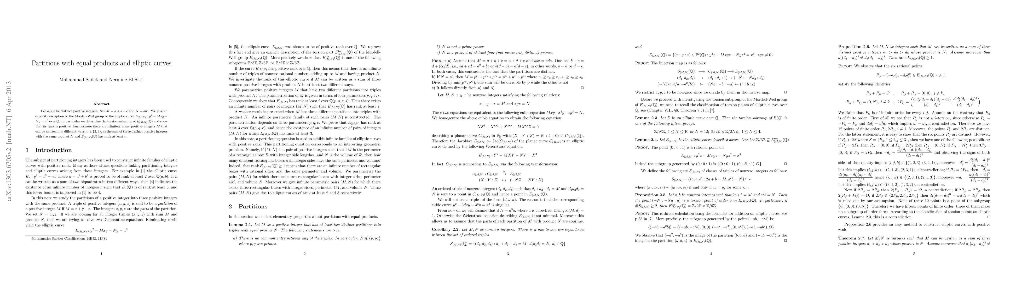 Let $a,b,c$ be distinct positive integers. Set $M=a+b+c$ and $N=abc$. We give an explicit description of the Mordell-Weil group of the elliptic curve $\displaystyle E_{(M,N)}:y^2-Mxy-Ny=x^3$ over $\Q$. In particular we determine the torsion subgroup of $E_{(M,N)}(\Q)$ and show that its rank is positive. Furthermore there are infinitely many positive integers $M$ that can be written in $n$ different ways, $n\in\{2,3\}$, as the sum of three distinct positive integers with the same product $N$ and $E_{(M,N)}(\Q)$ has rank at least $n$.