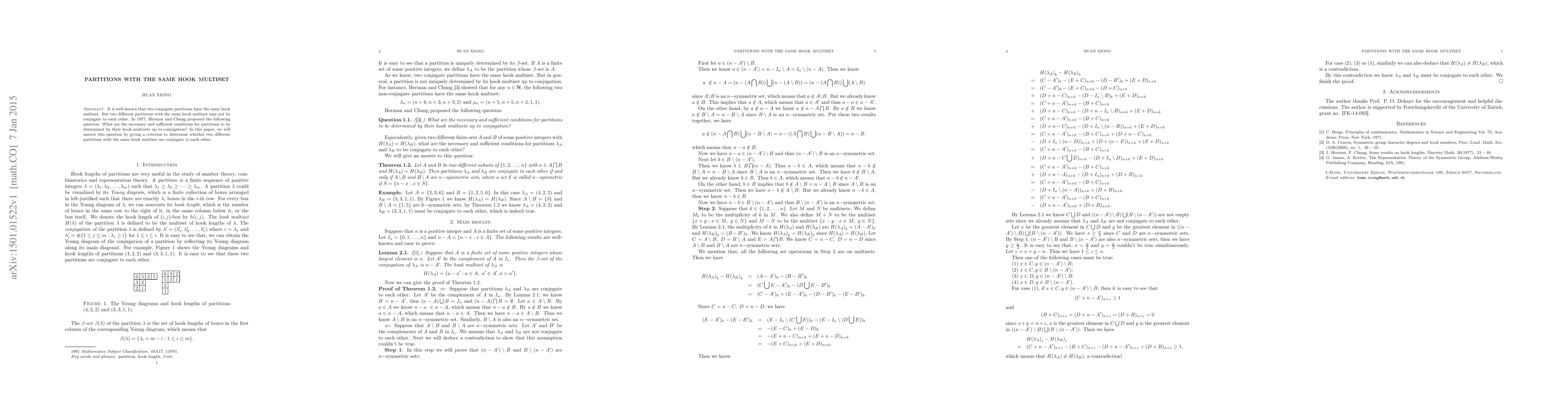 This paper addresses the question of determining whether two different partitions with the same hook multiset are conjugate. It provides a criterion to ascertain the necessary and sufficient conditions for such partitions to be conjugate, thus answering a question posed by Herman and Chung in 1977.