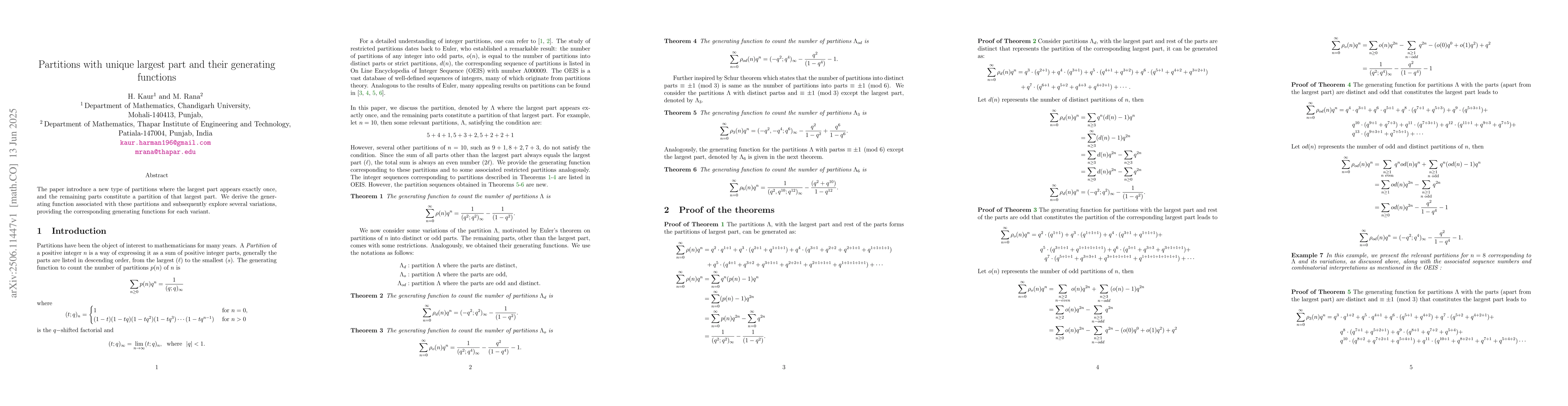 The paper introduce a new type of partitions where the largest part appears exactly once, and the remaining parts constitute a partition of that largest part. We derive the generating function associated with these partitions and subsequently explore several variations, providing the corresponding generating functions for each variant.