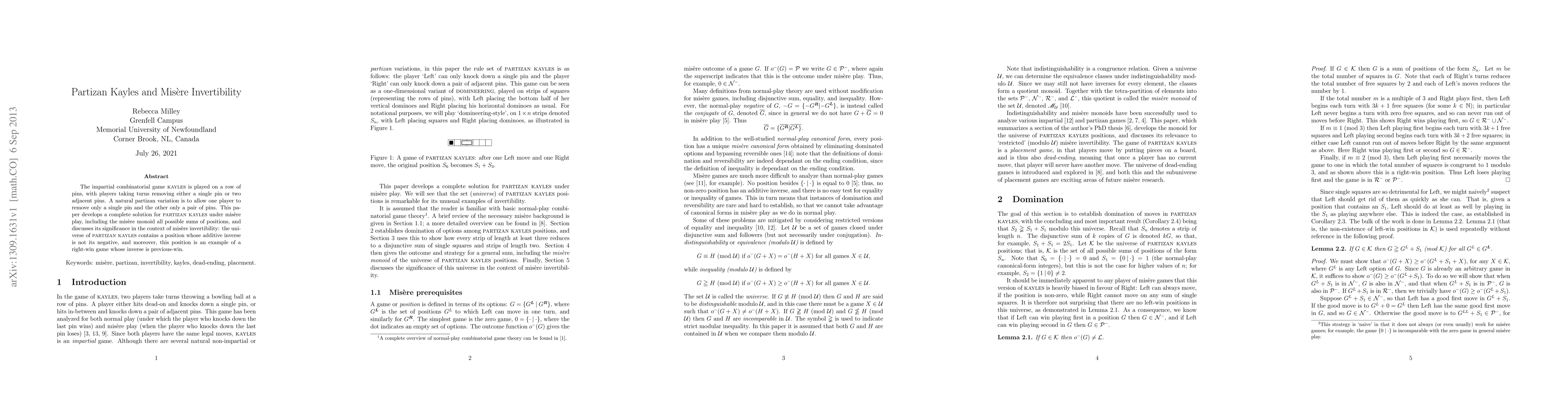 This paper provides a complete solution for the partizan variation of the game Kayles, where players have different removal rules, under misere play. It explores the misere monoid and discusses invertibility issues, revealing a position whose inverse is not its negative, highlighting unique win conditions.