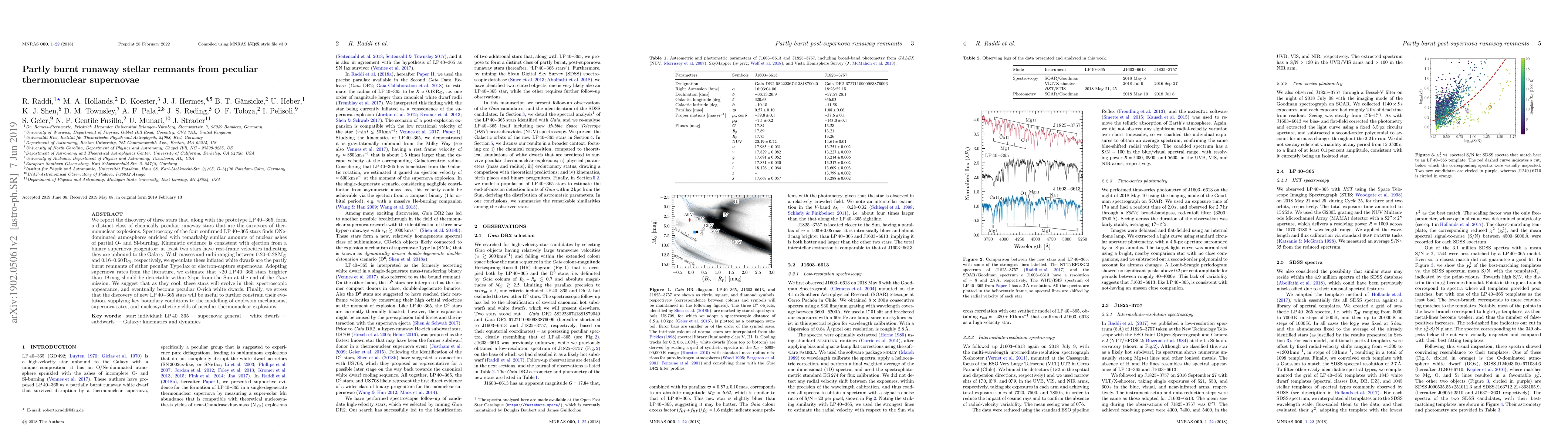 We report the discovery of three stars that, along with the prototype LP40-365, form a distinct class of chemically peculiar runaway stars that are the survivors of thermonuclear explosions. Spectroscopy of the four confirmed LP 40-365 stars finds ONe-dominated atmospheres enriched with remarkably similar amounts of nuclear ashes of partial O- and Si-burning. Kinematic evidence is consistent with ejection from a binary supernova progenitor; at least two stars have rest-frame velocities indicating they are unbound to the Galaxy. With masses and radii ranging between 0.20-0.28 Msun and 0.16-0.60 Rsun, respectively, we speculate these inflated white dwarfs are the partly burnt remnants of either peculiar Type Iax or electron-capture supernovae. Adopting supernova rates from the literature, we estimate that ~20 LP40-365 stars brighter than 19 mag should be detectable within 2 kpc from the Sun at the end of the Gaia mission. We suggest that as they cool, these stars will evolve in their spectroscopic appearance, and eventually become peculiar O-rich white dwarfs. Finally, we stress that the discovery of new LP40-365 stars will be useful to further constrain their evolution, supplying key boundary conditions to the modelling of explosion mechanisms, supernova rates, and nucleosynthetic yields of peculiar thermonuclear explosions.