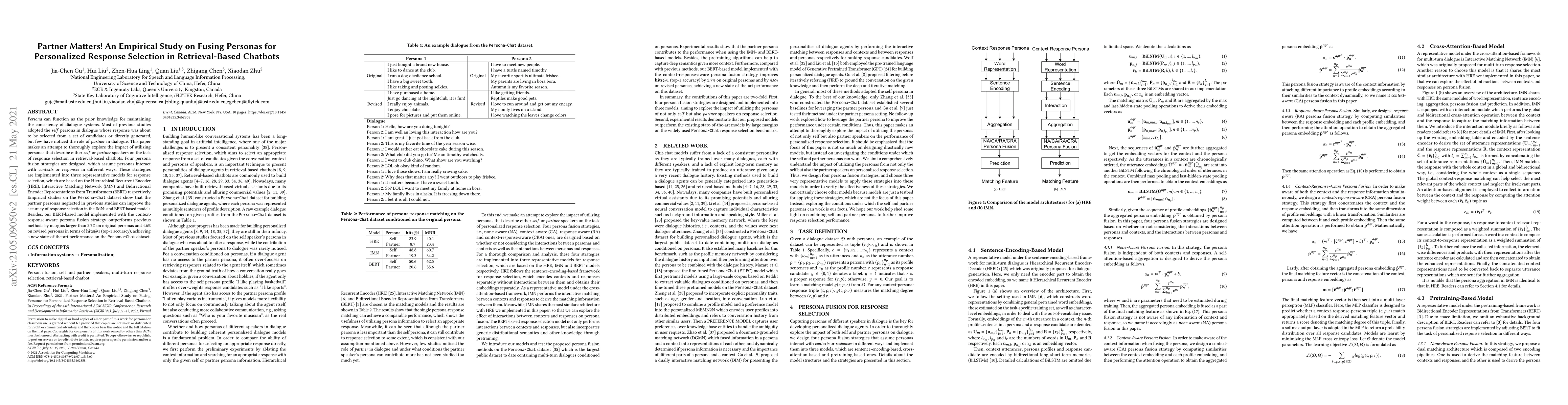 Persona can function as the prior knowledge for maintaining the consistency of dialogue systems. Most of previous studies adopted the self persona in dialogue whose response was about to be selected from a set of candidates or directly generated, but few have noticed the role of partner in dialogue. This paper makes an attempt to thoroughly explore the impact of utilizing personas that describe either self or partner speakers on the task of response selection in retrieval-based chatbots. Four persona fusion strategies are designed, which assume personas interact with contexts or responses in different ways. These strategies are implemented into three representative models for response selection, which are based on the Hierarchical Recurrent Encoder (HRE), Interactive Matching Network (IMN) and Bidirectional Encoder Representations from Transformers (BERT) respectively. Empirical studies on the Persona-Chat dataset show that the partner personas neglected in previous studies can improve the accuracy of response selection in the IMN- and BERT-based models. Besides, our BERT-based model implemented with the context-response-aware persona fusion strategy outperforms previous methods by margins larger than 2.7% on original personas and 4.6% on revised personas in terms of hits@1 (top-1 accuracy), achieving a new state-of-the-art performance on the Persona-Chat dataset.