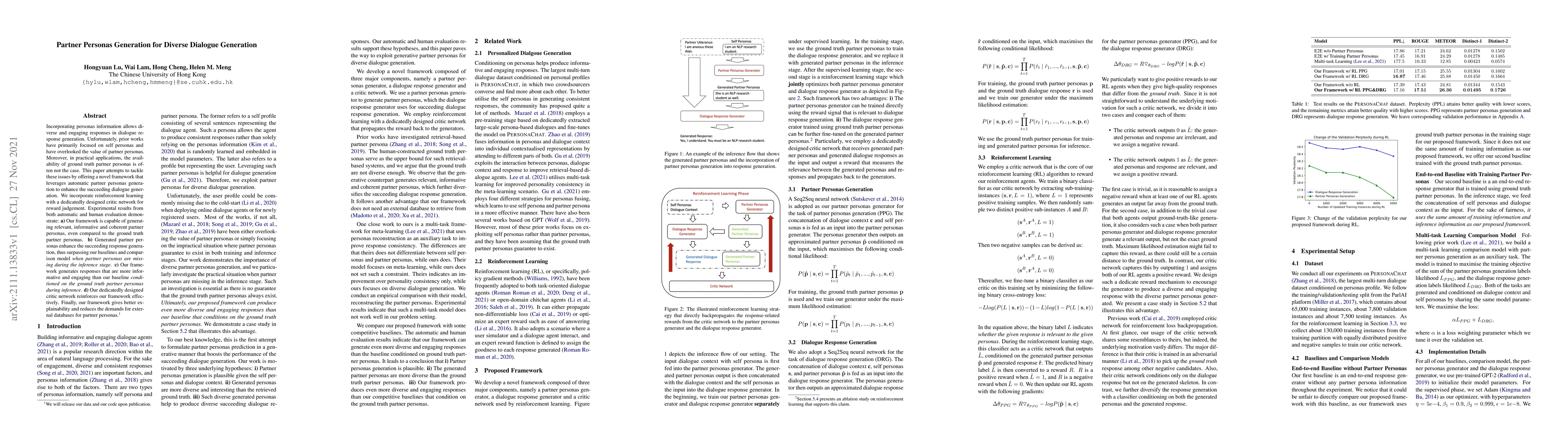 Incorporating personas information allows diverse and engaging responses in dialogue response generation. Unfortunately, prior works have primarily focused on self personas and have overlooked the value of partner personas. Moreover, in practical applications, the availability of ground truth partner personas is often not the case. This paper attempts to tackle these issues by offering a novel framework that leverages automatic partner personas generation to enhance the succeeding dialogue generation. We incorporate reinforcement learning with a dedicatedly designed critic network for reward judgement. Experimental results from both automatic and human evaluation demonstrate a) Our framework is capable of generating relevant, informative and coherent partner personas, even compared to the ground truth partner personas. b) Generated partner personas enhance the succeeding response generation, thus surpassing our baselines and comparison model when partner personas are missing during the inference stage. c) Our framework generates responses that are more informative and engaging than our baseline conditioned on the ground truth partner personas during inference. d) Our dedicatedly designed critic network reinforces our framework effectively. Finally, our framework gives better explainability and reduces the demands for external databases for partner personas.