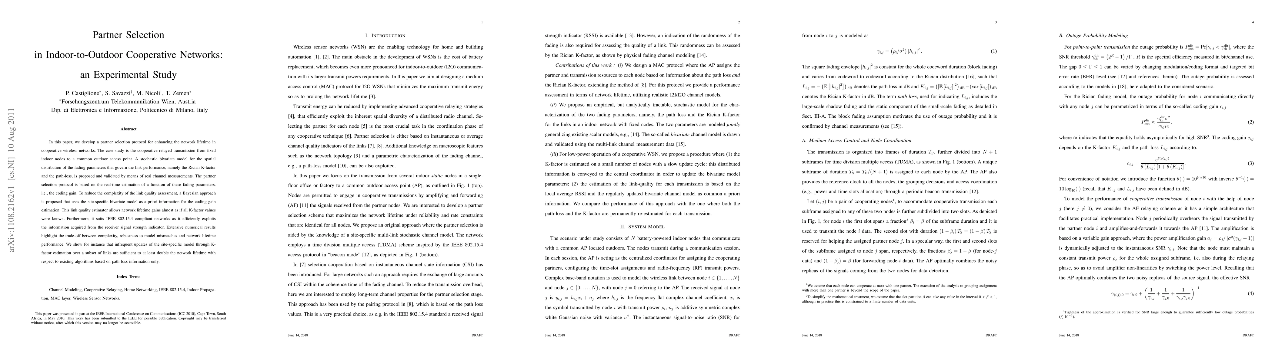 This paper proposes a partner selection protocol for indoor-to-outdoor cooperative wireless networks to enhance network lifetime, using a stochastic bivariate model for fading parameters and a Bayesian approach for coding gain estimation. The protocol significantly improves network lifetime by leveraging real-time link quality assessments, even with infrequent updates to the model.