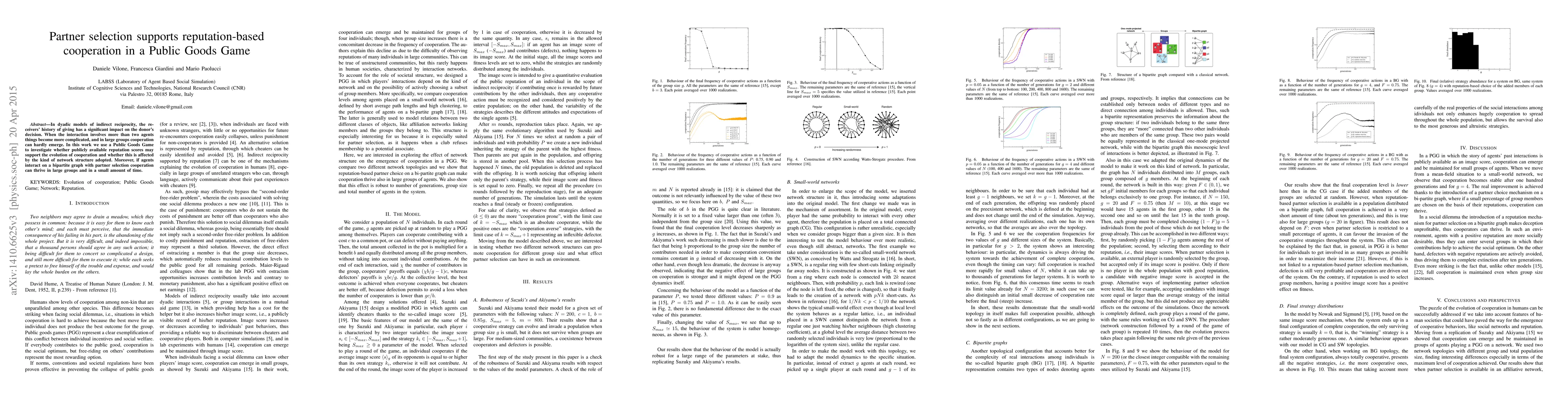 This study explores how publicly available reputation scores in a Public Goods Game can foster cooperation, particularly in large groups, and examines the impact of different network structures, finding that partner selection on a bipartite graph significantly enhances cooperation.