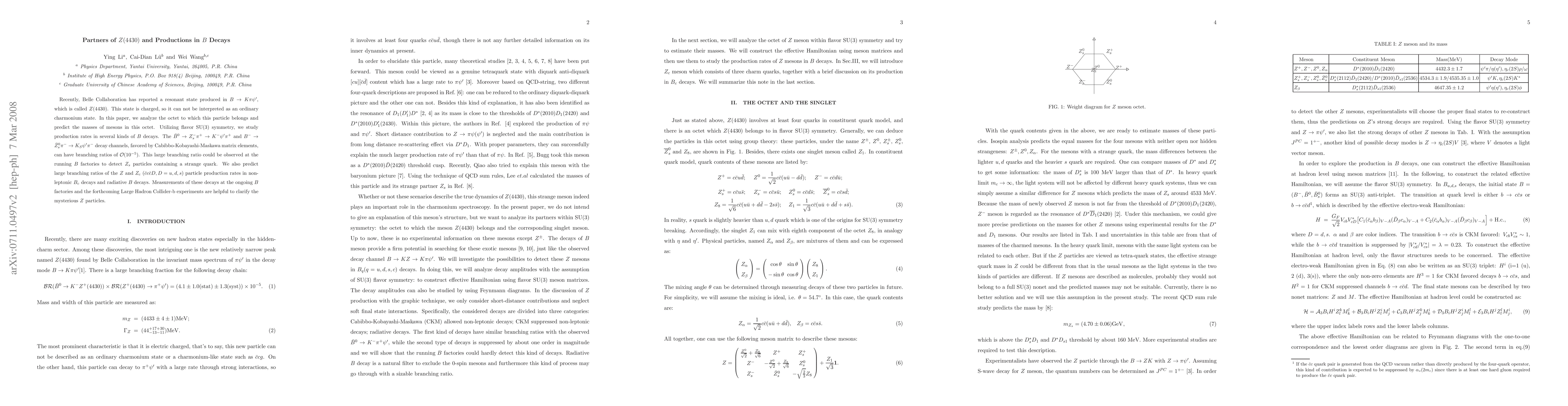The paper analyzes the octet to which the Z(4430) particle belongs using flavor SU(3) symmetry, predicting masses of mesons in this octet. It also studies production rates in B decays, favoring channels like $\bar B^0\to Z_s^-\pi^+\to K^-\psi'\pi^+$ and $B^-\to \bar Z_s^0 \pi^-\to K_S\psi'\pi^-$ for detection of $Z_s$ particles.