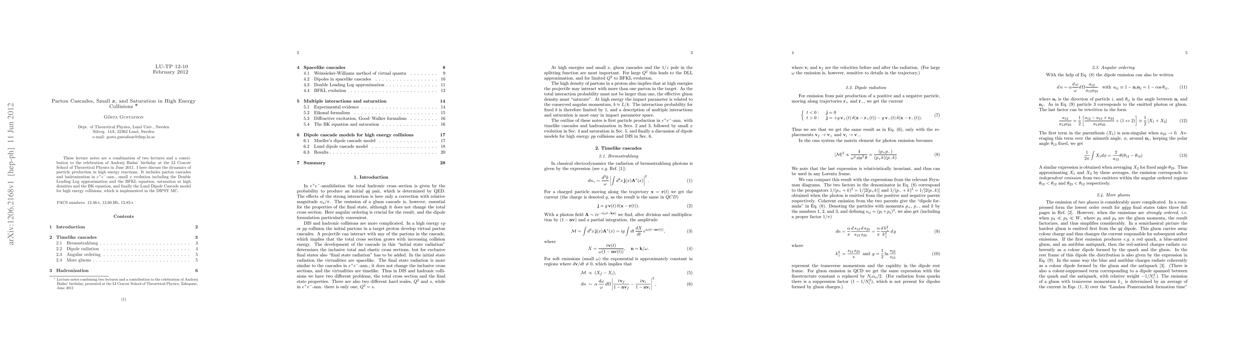 These lecture notes are a combination of two lectures and a contribution to the celebration of Andrzej Bia{\l}as' birthday at the LI Cracow School of Theoretical Physics in June 2011. I here discuss the dynamics of particle production in high energy reactions. It includes parton cascades and hadronization in e+e--ann., small x evolution including the Double Leading Log approximation and the BFKL equation, saturation at high densities and the BK equation, and finally the Lund Dipole Cascade model for high energy collisions, which is implemented in the DIPSY MC.