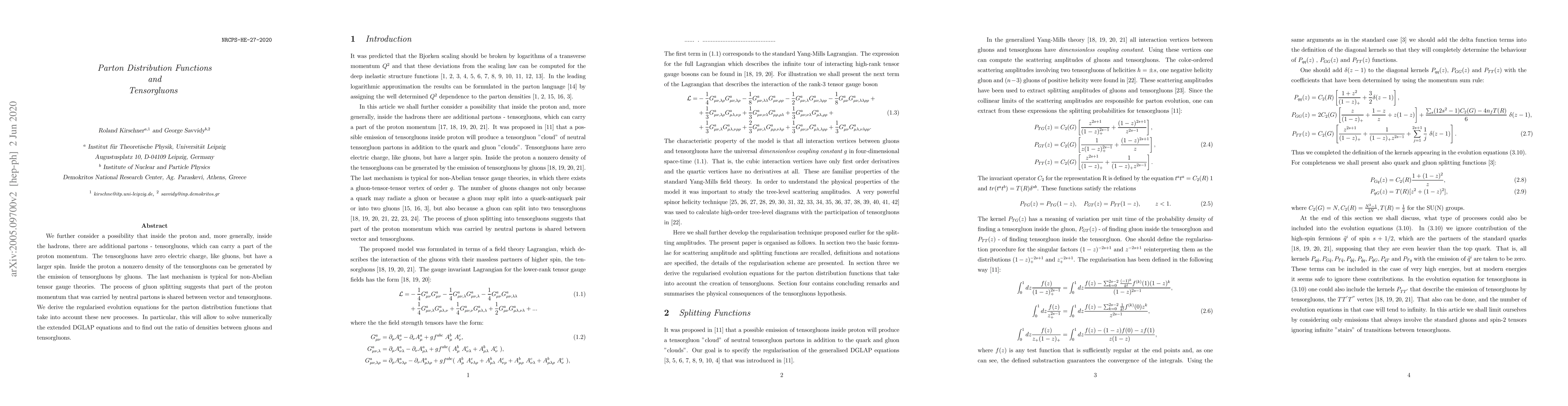 We further consider a possibility that inside the proton and, more generally, inside the hadrons, there are additional partons - tensor gluons, which can carry a part of the proton momentum. The tensorgluons have zero electric charge, like gluons, but have a larger spin. Inside the proton a nonzero density of the tensorgluons can be generated by the emission of tensorgluons by gluons. The last mechanism is typical for non-Abelian tensor gauge theories. The process of gluon splitting suggests that part of the proton momentum that was carried by neutral partons is shared between vector and tensor gluons. We derive the regularised evolution equations for the parton distribution functions that take into account these new processes. In particular, this will allow to solve numerically the extended DIGLAP equations and to find out the ratio of densities between gluons and tensorgluons.