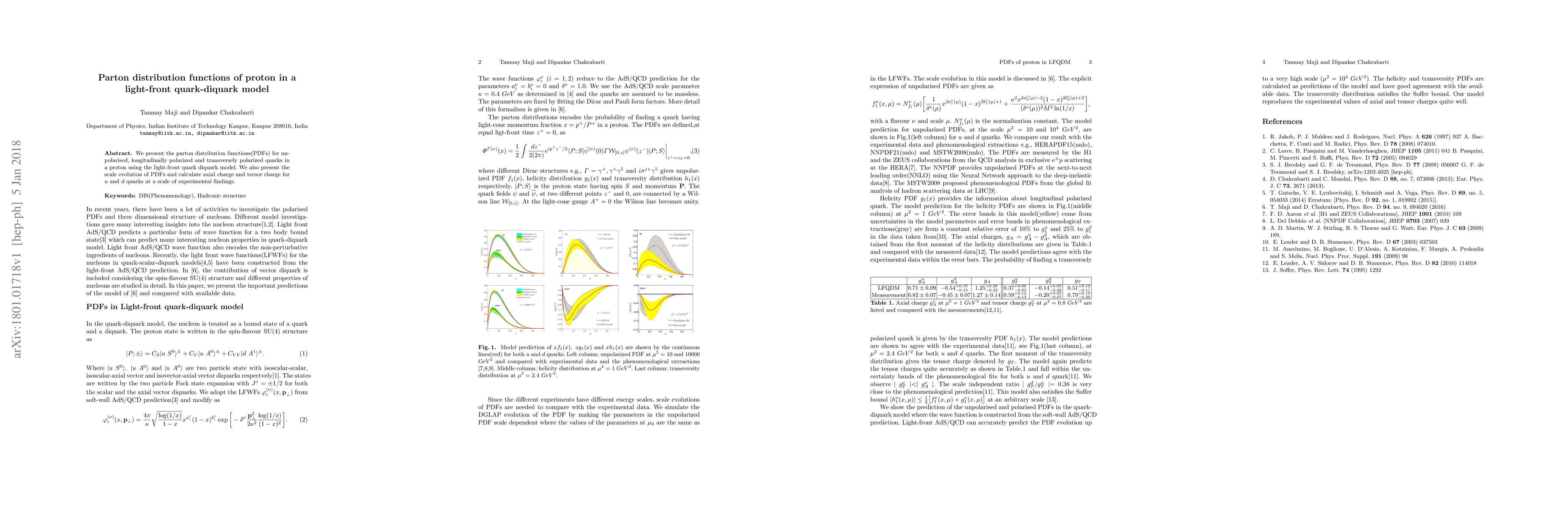 Researchers present parton distribution functions for proton quarks in a light-front model, including scale evolution and calculation of axial and tensor charges, providing insights into proton properties.