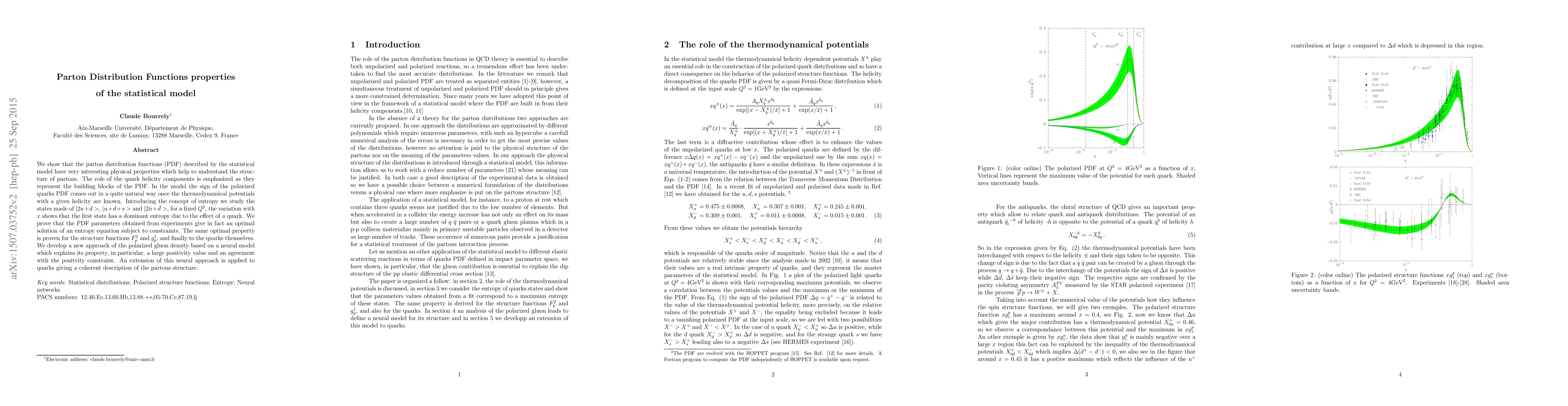 We show that the parton distribution functions (PDF) described by the statistical model have very interesting physical properties which help to understand the structure of partons. The role of the quark helicity components is emphasized as they represent the building blocks of the PDF. In the model the sign of the polarized quarks PDF comes out in a quite natural way once the thermodynamical potentials with a given helicity are known. Introducing the concept of entropy we study the states madeof |2u + d >, |u +d +s > and $|2\bar u +\bar d >$, for a fixed Q^2, the variation with x shows that the first state has a dominant entropy due to the effect of u quark. We prove that the PDF parameters obtained from experiments give in fact an optimal solution of an entropy equation subject to constraints. We develop a new approach of the polarized gluon density based on a neural model which explains its property, in particular, a large positivity value and an agreement with the positvity constraint. An extension of this neural approach is applied to quarks giving a coherent description of the partons structure.