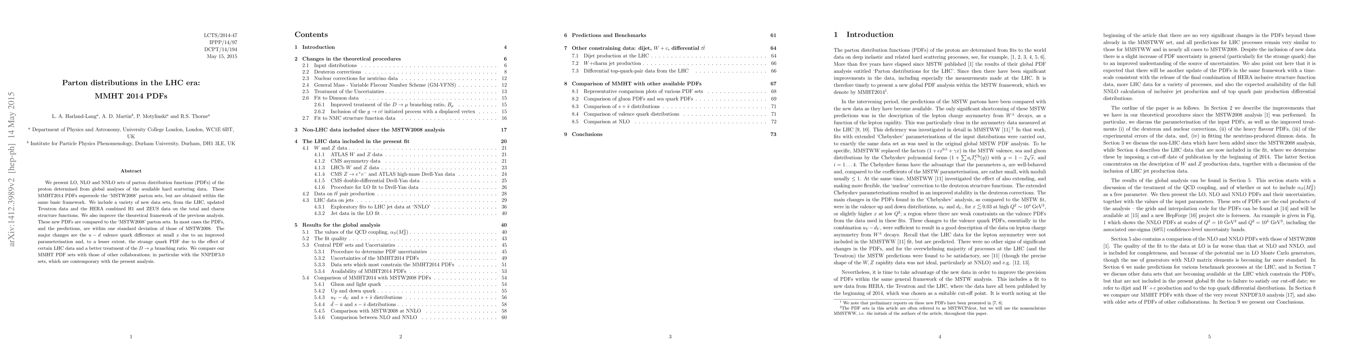 The MMHT 2014 parton distribution functions (PDFs) provide updated sets at LO, NLO, and NNLO, incorporating new LHC, Tevatron, and HERA data, and supersede the MSTW2008 sets while maintaining the same framework. Major changes include improved $u-d$ valence quark difference and a refined strange quark PDF.