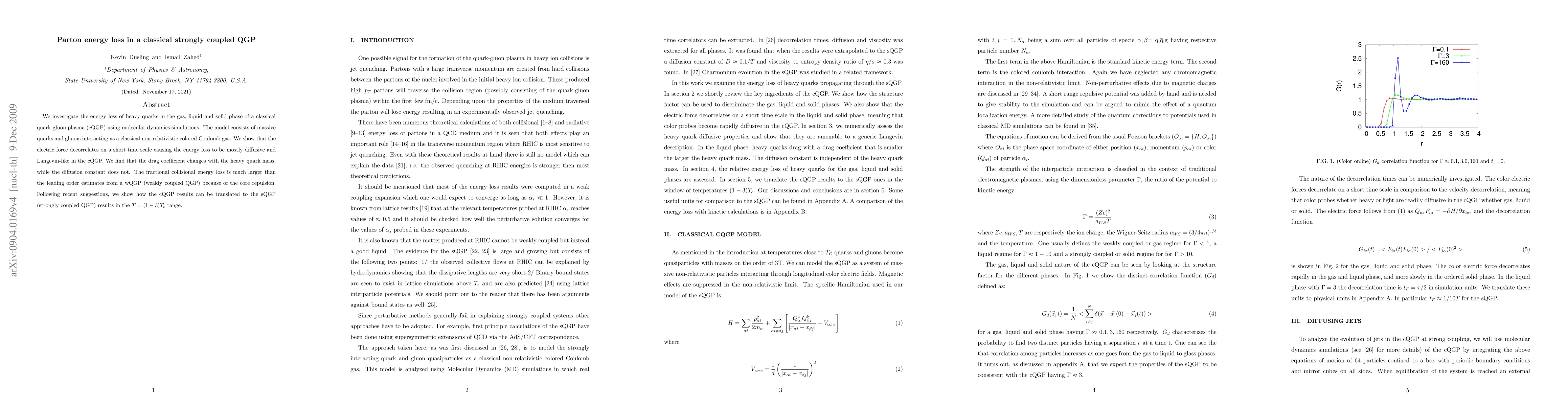 We investigate the energy loss of heavy quarks in the gas, liquid and solid phase of a classical quark-gluon plasma (cQGP) using molecular dynamics simulations. The model consists of massive quarks and gluons interacting as a classical non-relativistic colored Coulomb gas. We show that the electric force decorrelates on a short time scale causing the energy loss to be mostly diffusive and langevin-like in the cQGP. We find that the drag coefficient changes with the heavy quark mass, while the diffusion constant does not. The fractional collisional energy loss is much larger than the leading order estimates from a wQGP because of the core repulsion. Following recent suggestions, we show how the cQGP results can be translated to the sQGP results in the $T=(1-3)T_c$ range.