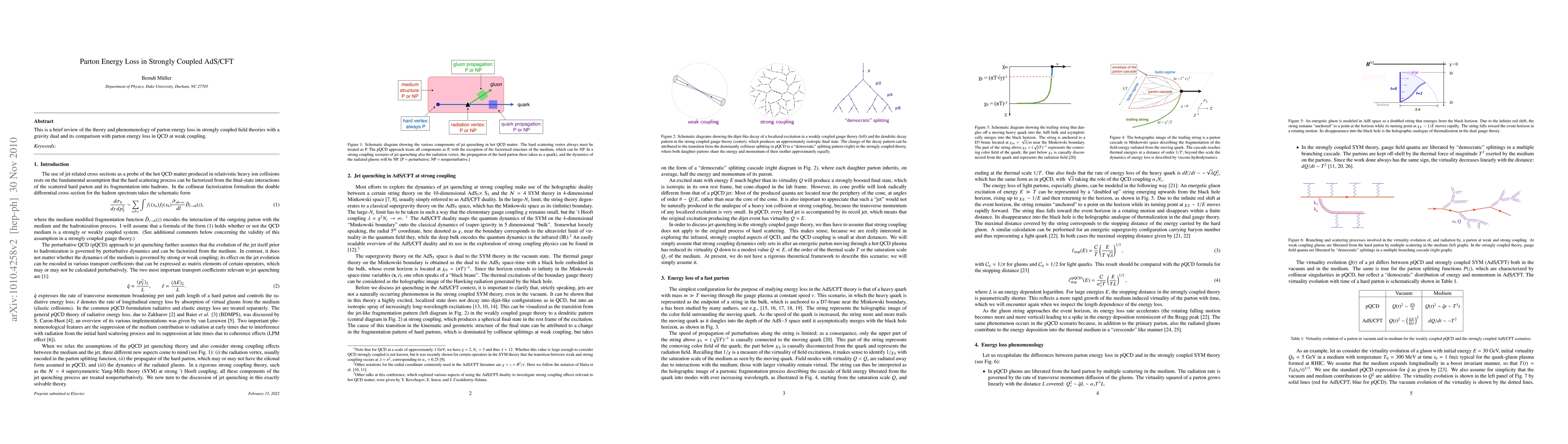 This is a brief review of the theory and phenomenology of parton energy loss in strongly coupled field theories with a gravity dual and its comparison with parton energy loss in QCD at weak coupling.