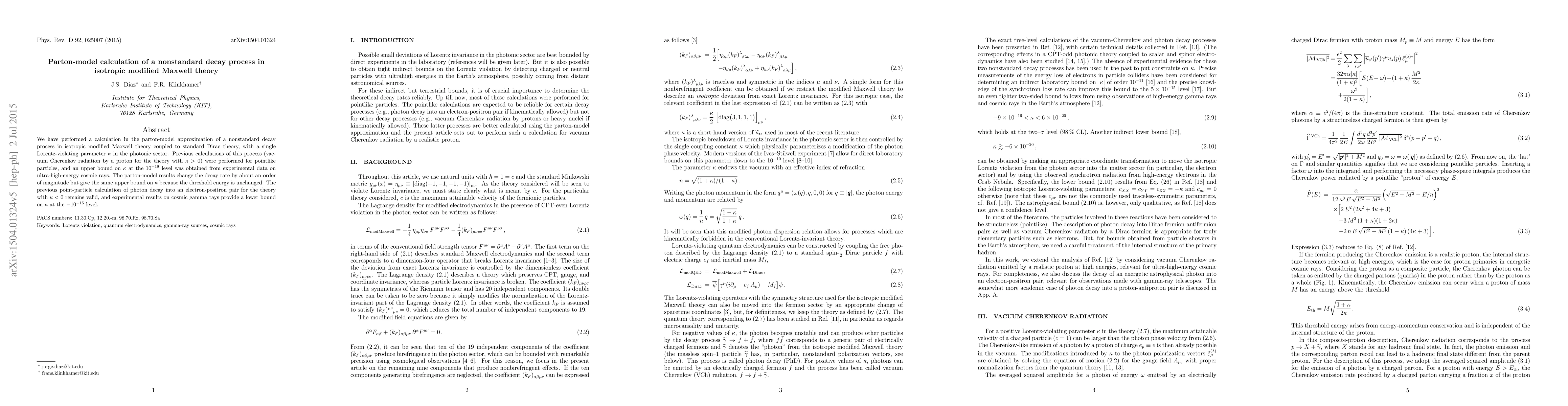 We have performed a calculation in the parton-model approximation of a nonstandard decay process in isotropic modified Maxwell theory coupled to standard Dirac theory, with a single Lorentz-violating parameter $\kappa$ in the photonic sector. Previous calculations of this process (vacuum Cherenkov radiation by a proton for the theory with $\kappa>0$) were performed for pointlike particles, and an upper bound on $\kappa$ at the $10^{-19}$ level was obtained from experimental data on ultra-high-energy cosmic rays. The parton-model results change the decay rate by about an order of magnitude but give the same upper bound on $\kappa$ because the threshold energy is unchanged. The previous point-particle calculation of photon decay into an electron-positron pair for the theory with $\kappa<0$ remains valid, and experimental results on cosmic gamma rays provide a lower bound on $\kappa$ at the $-10^{-15}$ level.