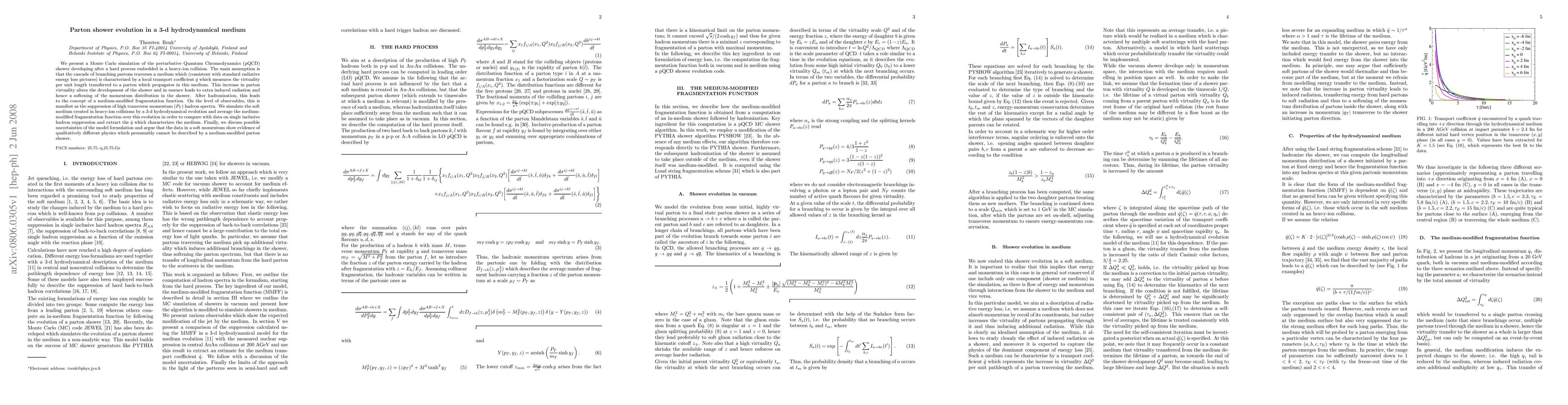 We present a Monte Carlo simulation of the perturbative Quantum Chromodynamics (pQCD) shower developing after a hard process embedded in a heavy-ion collision. The main assumption is that the cascade of branching partons traverses a medium which (consistent with standard radiative energy loss pictures) is characterized by a local transport coefficient qhat which measures the virtuality per unit length transferred to a parton which propagates in this medium. This increase in parton virtuality alters the development of the shower and in essence leads to extra induced radiation and hence a softening of the momentum distribution in the shower. After hadronization, this leads to the concept of a medium-modified fragmentation function. On the level of observables, this is manifest as the suppression of high transverse momentum (PT) hadron spectra. We simulate the soft medium created in heavy-ion collisions by a 3-d hydrodynamical evolution and average the medium-modified fragmentation function over this evolution in order to compare with data on single inclusive hadron suppression and extract the qhat which characterizes the medium. Finally, we discuss possible uncertainties of the model formulation and argue that the data in a soft momentum show evidence of qualitatively different physics which presumably cannot be described by a medium-modified parton shower.