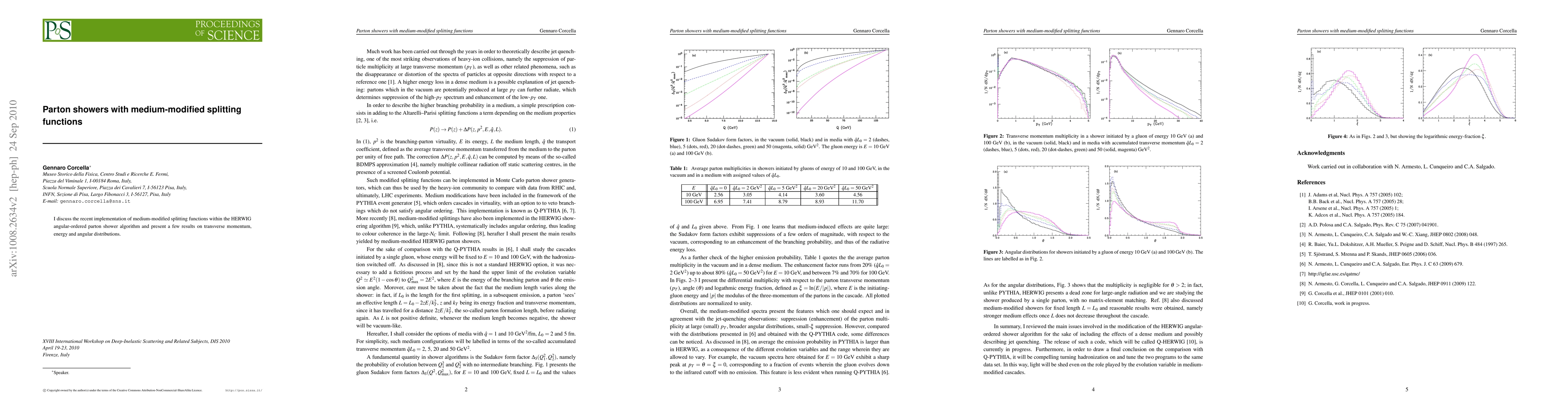 This paper details the integration of medium-modified splitting functions into the HERWIG angular-ordered parton shower algorithm, showcasing results on transverse momentum, energy, and angular distributions in high-energy particle collisions.