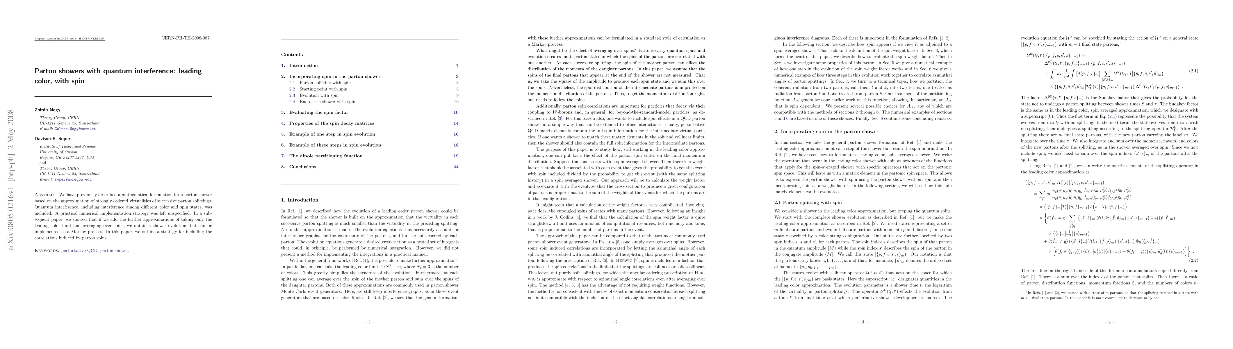 We have previously described a mathematical formulation for a parton shower based on the approximation of strongly ordered virtualities of successive parton splittings. Quantum interference, including interference among different color and spin states, was included. A practical numerical implementation strategy was left unspecified. In a subsequent paper, we showed that if we add the further approximations of taking only the leading color limit and averaging over spins, we obtain a shower evolution that can be implemented as a Markov process. In this paper, we outline a strategy for including the correlations induced by parton spins.