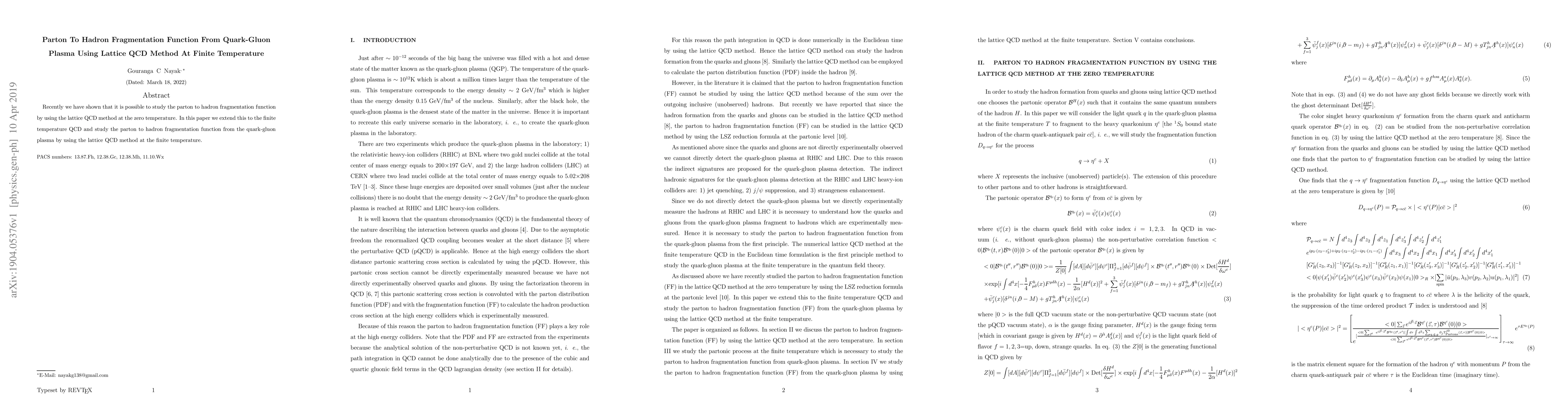 Recently we have shown that it is possible to study the parton to hadron fragmentation function by using the lattice QCD method at the zero temperature. In this paper we extend this to the finite temperature QCD and study the parton to hadron fragmentation function from the quark-gluon plasma by using the lattice QCD method at the finite temperature.