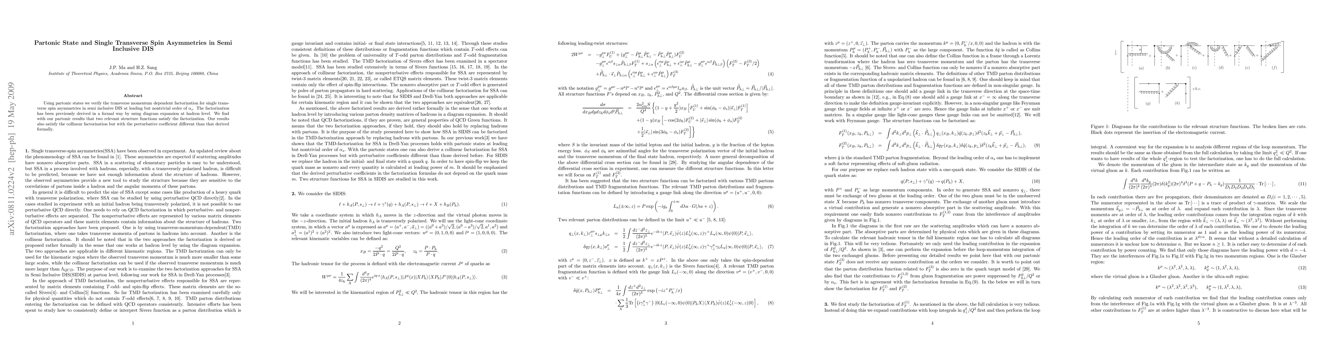 This paper verifies the transverse momentum dependent factorization for single transverse spin asymmetries in semi inclusive Deep Inelastic Scattering (DIS) using partonic states, confirming the factorization for two relevant structure functions and noting a difference in the perturbative coefficient compared to formal derivations.