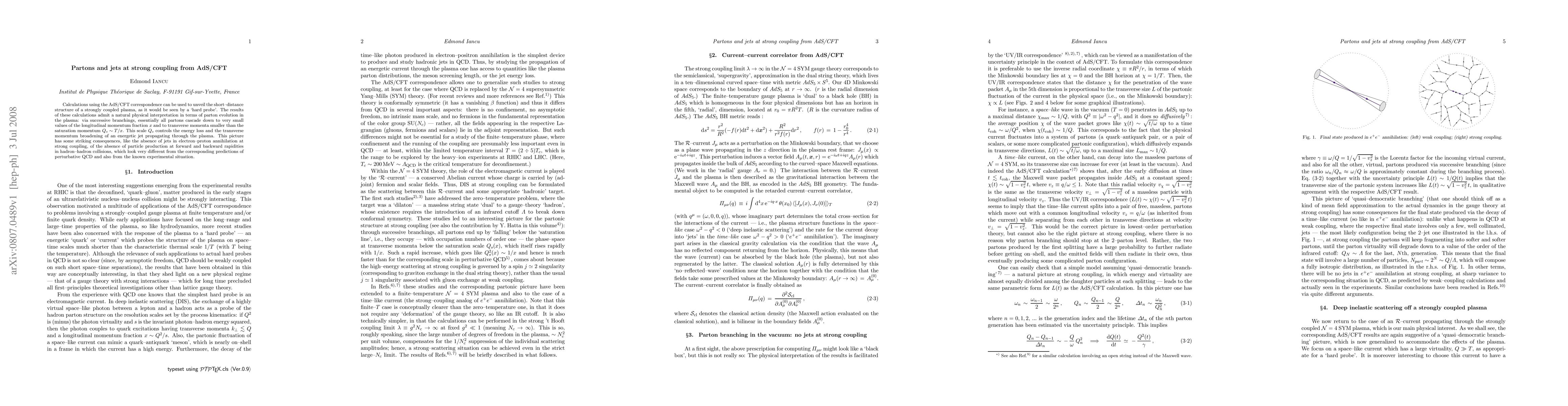 Calculations using the AdS/CFT correspondence can be used to unveil the short-distance structure of a strongly coupled plasma, as it would be seen by a `hard probe'. The results of these calculations admit a natural physical interpretation in terms of parton evolution in the plasma: via successive branchings, essentially all partons cascade down to very small values of the longitudinal momentum fraction x and to transverse momenta smaller than the saturation momentum Q_s\sim T/x. This scale Q_s controls the energy loss and the transverse momentum broadening of an energetic jet propagating through the plasma. This picture has some striking consequences, like the absence of jets in electron-proton annihilation at strong coupling, of the absence of particle production at forward and backward rapidities in hadron-hadron collisions, which look very different from the corresponding predictions of perturbative QCD and also from the known experimental situation.