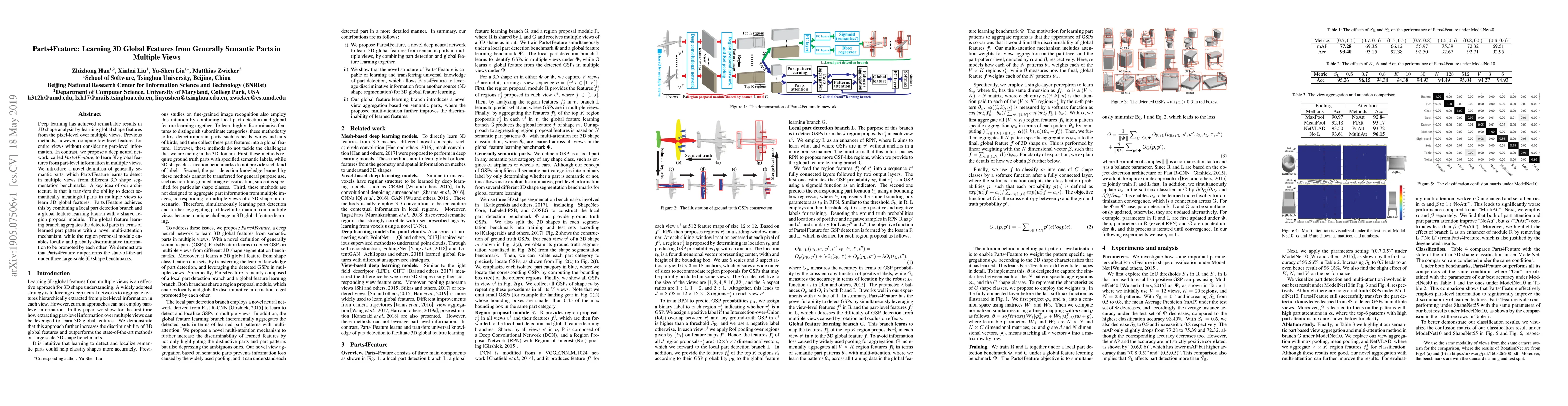 The paper introduces Parts4Feature, a deep neural network that learns 3D global features from part-level information in multiple views, using a local part detection and global feature learning architecture with a shared region proposal module. Parts4Feature outperforms existing methods on three large-scale 3D shape benchmarks.