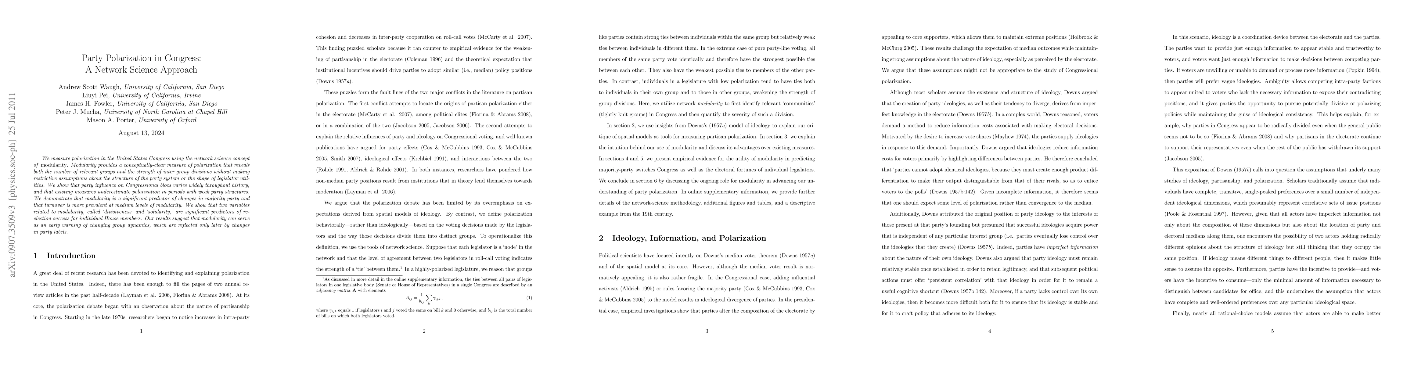 We measure polarization in the United States Congress using the network science concept of modularity. Modularity provides a conceptually-clear measure of polarization that reveals both the number of relevant groups and the strength of inter-group divisions without making restrictive assumptions about the structure of the party system or the shape of legislator utilities. We show that party influence on Congressional blocs varies widely throughout history, and that existing measures underestimate polarization in periods with weak party structures. We demonstrate that modularity is a significant predictor of changes in majority party and that turnover is more prevalent at medium levels of modularity. We show that two variables related to modularity, called `divisiveness' and `solidarity,' are significant predictors of reelection success for individual House members. Our results suggest that modularity can serve as an early warning of changing group dynamics, which are reflected only later by changes in party labels.