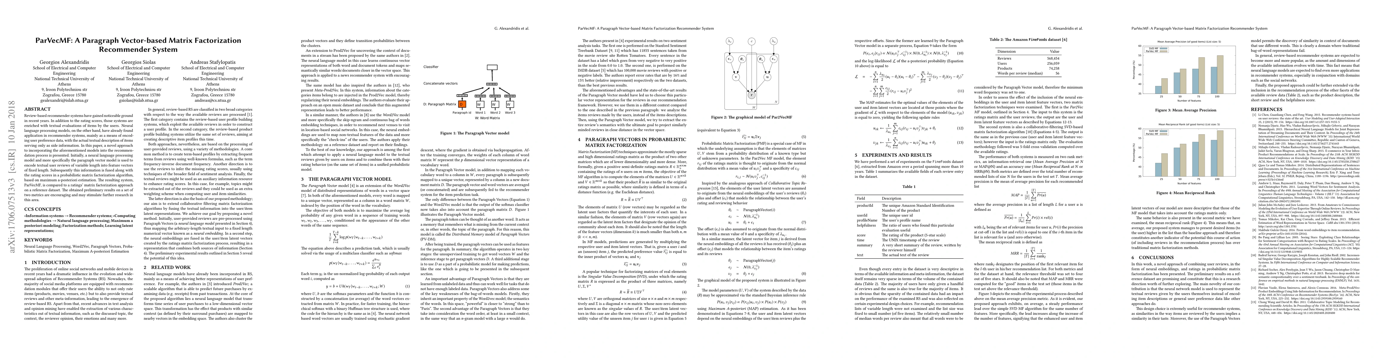 ParVecMF integrates paragraph vector models to encode textual user reviews into feature vectors, which are then fused with rating scores in a probabilistic matrix factorization algorithm. Preliminary results suggest its potential to outperform traditional matrix factorization recommender systems.