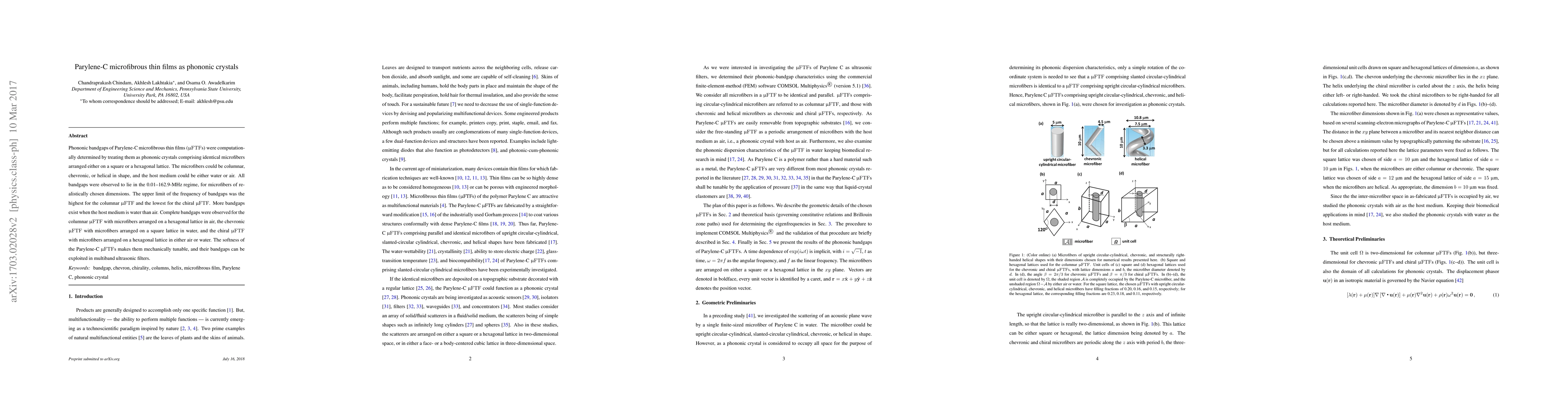 This paper investigates the phononic bandgaps of Parylene-C microfibrous thin films treated as phononic crystals, finding bandgaps in the 0.01-to-162.9 MHz range, with the highest frequency bandgaps for columnar structures and more bandgaps in water. The study highlights potential applications in mechanically tunable multiband ultrasonic filters.