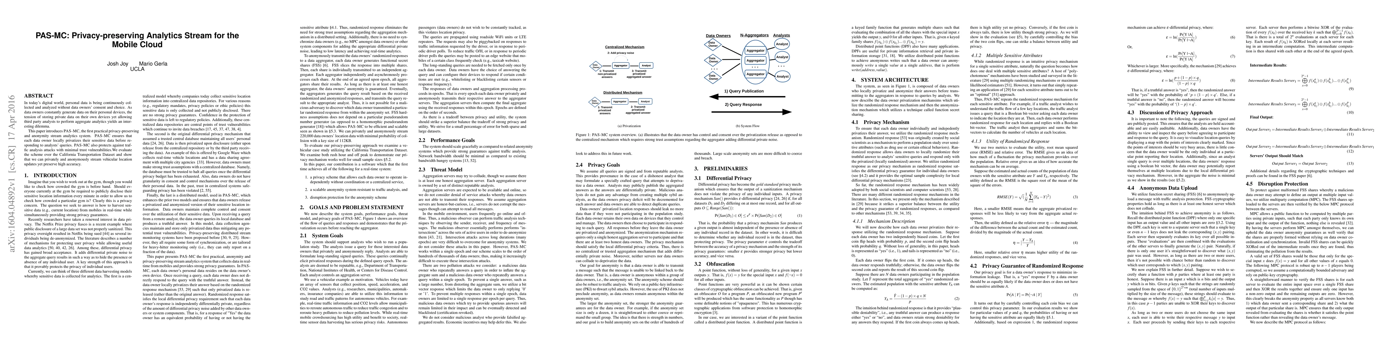 In today's digital world, personal data is being continuously collected and analyzed without data owners' consent and choice. As data owners constantly generate data on their personal devices, the tension of storing private data on their own devices yet allowing third party analysts to perform aggregate analytics yields an interesting dilemma. This paper introduces PAS-MC, the first practical privacy-preserving and anonymity stream analytics system. PAS-MC ensures that each data owner locally privatizes their sensitive data before responding to analysts' queries. PAS-MC also protects against traffic analysis attacks with minimal trust vulnerabilities.We evaluate the scheme over the California Transportation Dataset and show that we can privately and anonymously stream vehicular location updates yet preserve high accuracy.