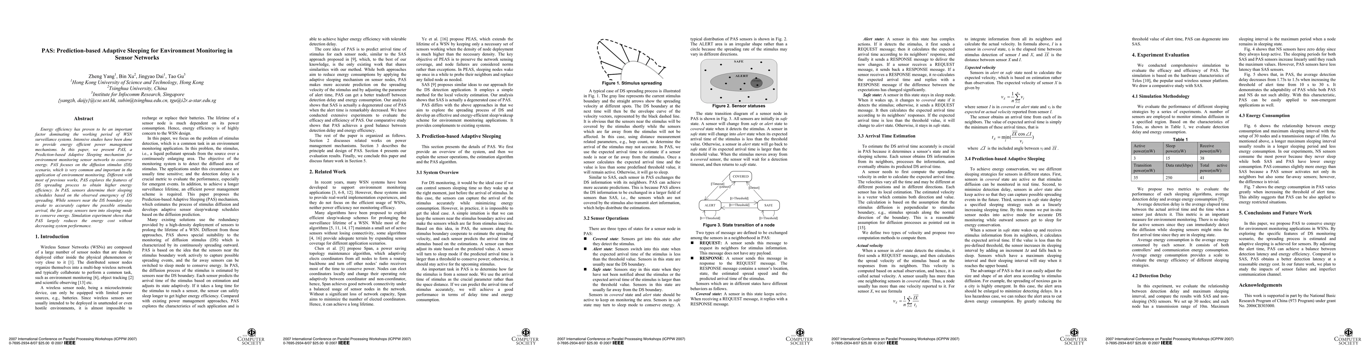 This paper proposes PAS, a prediction-based adaptive sleeping mechanism for sensor networks to conserve energy in environment monitoring, achieving significant reductions without compromising system performance.