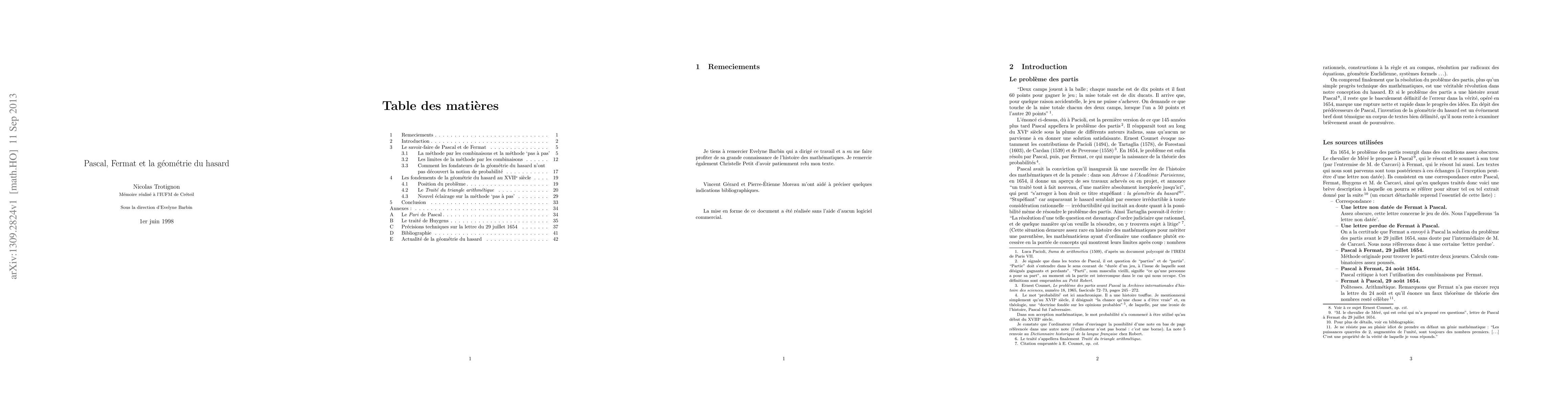 This 1998 report from IUFM Créteil under Evelyne Barbin explores the origins of probability theory, focusing on the correspondence between Pascal and Fermat and Pascal's "Treatise on the Arithmetical Triangle." It sheds light on the early development of probability calculations through historical documents.