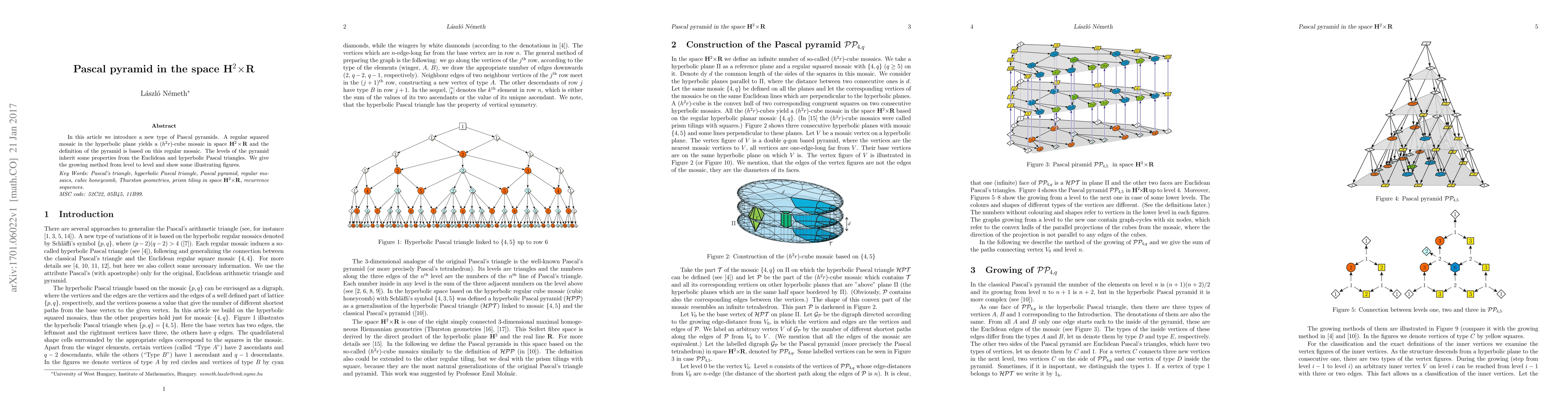In this article we introduce a new type of Pascal pyramids. A regular squared mosaic in the hyperbolic plane yields a $(h^2r)$-cube mosaic in space $\mathbf{H}^2\!\times\!\mathbf{R}$ and the definition of the pyramid is based on this regular mosaic. The levels of the pyramid inherit some properties from the Euclidean and hyperbolic Pascal triangles. We give the growing method from level to level and show some illustrating figures.