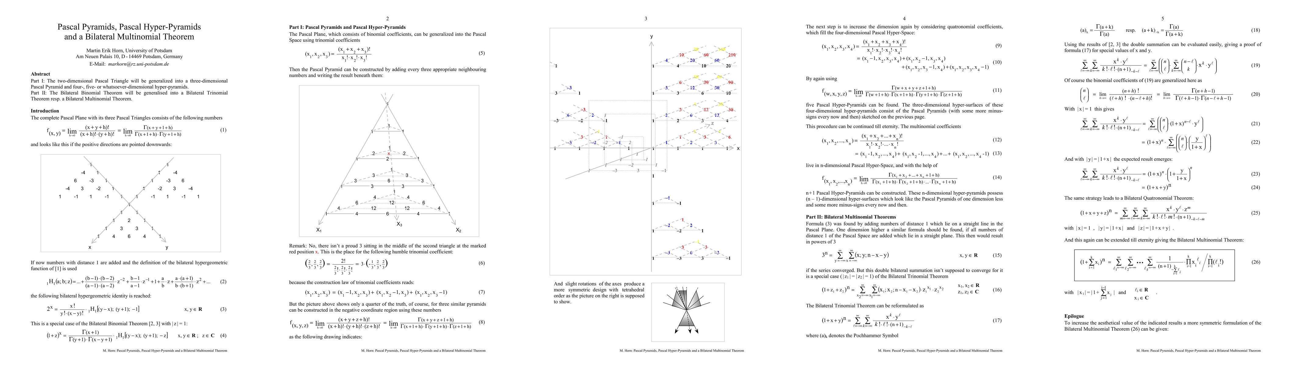 Part I: The two-dimensional Pascal Triangle will be generalized into a three-dimensional Pascal Pyramid and four-, five- or whatsoever-dimensional hyper-pyramids. Part II: The Bilateral Binomial Theorem will be generalised into a Bilateral Trinomial Theorem resp. a Bilateral Multinomial Theorem.