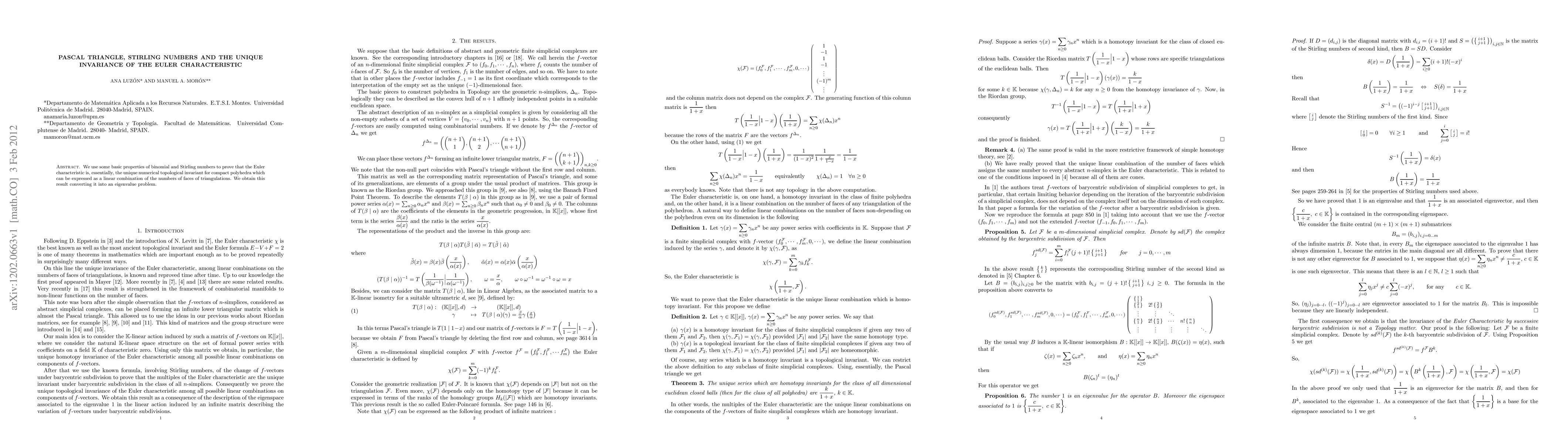 We use some basic properties of binomial and Stirling numbers to prove that the Euler characteristic is, essentially, the unique numerical topological invariant for compact polyhedra which can be expressed as a linear combination of the numbers of faces of triangulations. We obtain this result converting it into an eigenvalue problem.