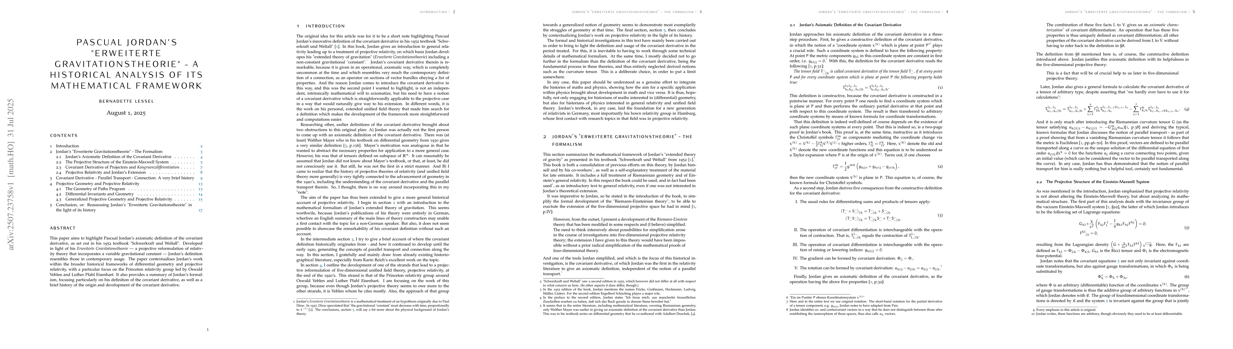This paper aims to highlight Pascual Jordan's axiomatic definition of the covariant derivative, as set out in his 1952 textbook "Schwerkraft und Weltall". Developed in light of his \emph{Erweiterte Gravitationstheorie} - a projective reformulation of relativity theory that incorporates a variable gravitational constant - Jordan's definition resembles those in contemporary usage. The paper contextualises Jordan's work within the broader historical frameworks of differential geometry and projective relativity, with a particular focus on the Princeton relativity group led by Oswald Veblen and Luther Pfahl Eisenhart. It also provides a summary of Jordan's formalism, focusing particularly on his definition of the covariant derivative, as well as a brief history of the origin and development of the covariant derivative.