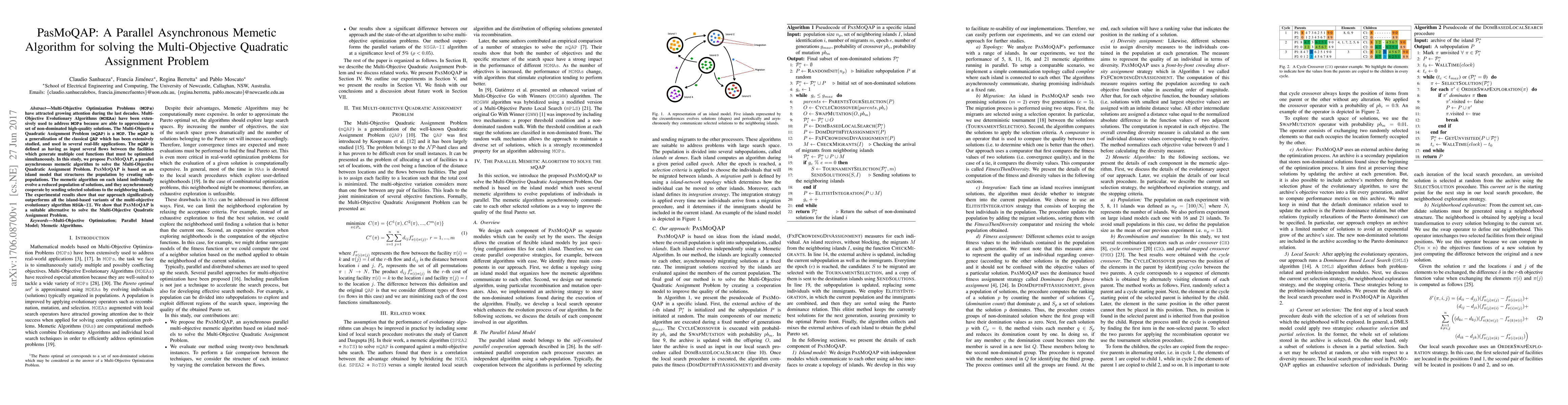 PasMoQAP is a parallel asynchronous memetic algorithm for solving the Multi-Objective Quadratic Assignment Problem (mQAP), which outperforms island-based variants of NSGA-II in experimental results. It employs an island model to cooperatively evolve sub-populations and asynchronously share solutions.