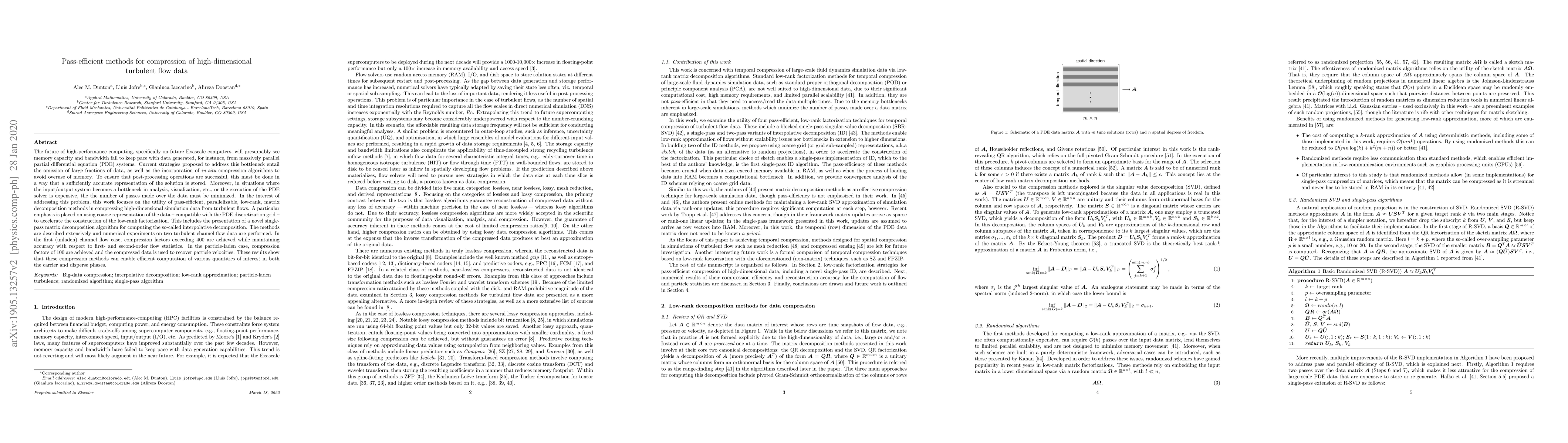 The future of high-performance computing, specifically on future Exascale computers, will presumably see memory capacity and bandwidth fail to keep pace with data generated, for instance, from massively parallel partial differential equation (PDE) systems. Current strategies proposed to address this bottleneck entail the omission of large fractions of data, as well as the incorporation of $\textit{in situ}$ compression algorithms to avoid overuse of memory. To ensure that post-processing operations are successful, this must be done in a way that a sufficiently accurate representation of the solution is stored. Moreover, in situations where the input/output system becomes a bottleneck in analysis, visualization, etc., or the execution of the PDE solver is expensive, the the number of passes made over the data must be minimized. In the interest of addressing this problem, this work focuses on the utility of pass-efficient, parallelizable, low-rank, matrix decomposition methods in compressing high-dimensional simulation data from turbulent flows. A particular emphasis is placed on using coarse representation of the data -- compatible with the PDE discretization grid -- to accelerate the construction of the low-rank factorization. This includes the presentation of a novel single-pass matrix decomposition algorithm for computing the so-called interpolative decomposition. The methods are described extensively and numerical experiments on two turbulent channel flow data are performed. In the first (unladen) channel flow case, compression factors exceeding $400$ are achieved while maintaining accuracy with respect to first- and second-order flow statistics. In the particle-laden case, compression factors of 100 are achieved and the compressed data is used to recover particle velocities.