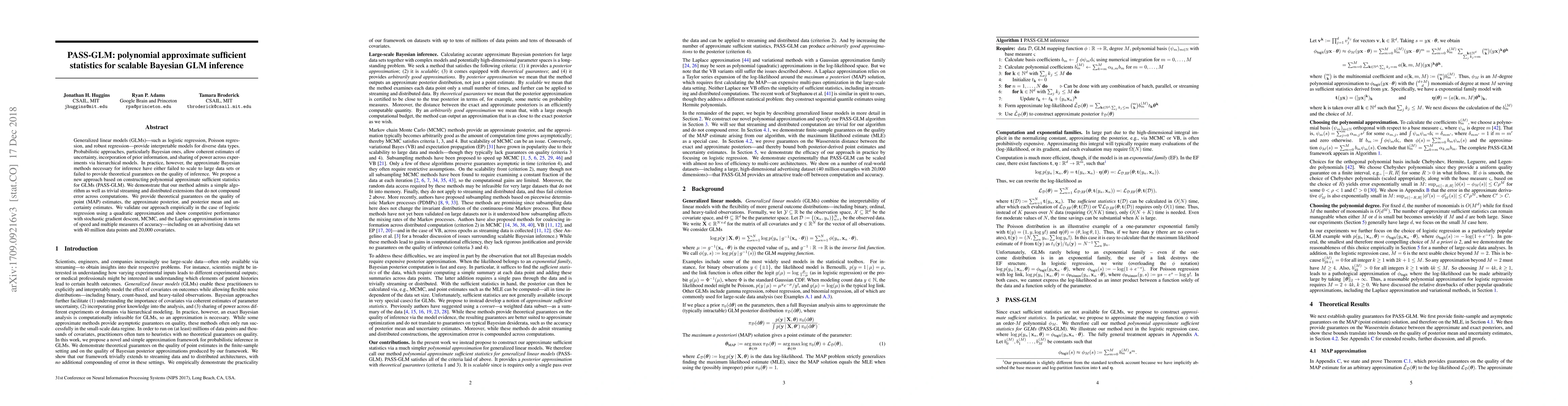 The paper introduces PASS-GLM, a scalable Bayesian inference method for generalized linear models that constructs polynomial approximate sufficient statistics. It provides theoretical guarantees on the quality of inference and demonstrates competitive performance in terms of speed and accuracy, especially on large datasets.