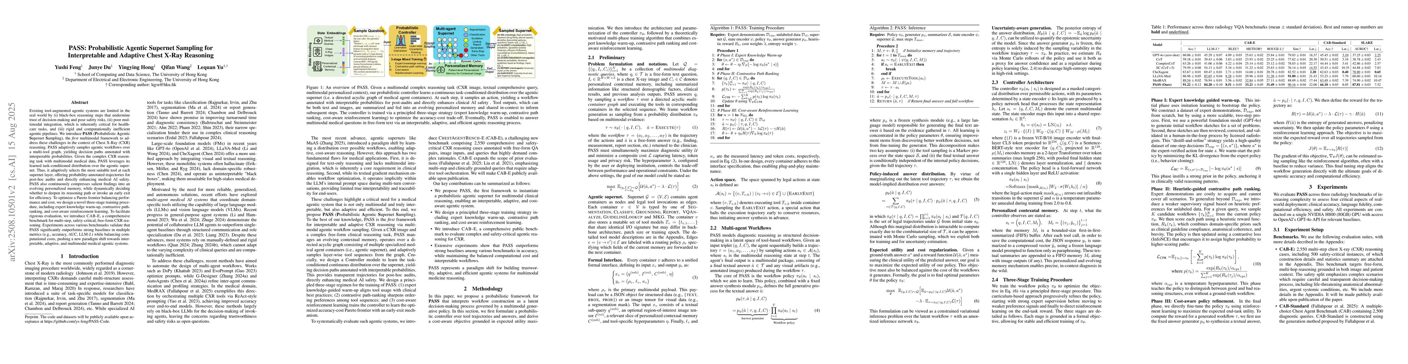 Existing tool-augmented agentic systems are limited in the real world by (i) black-box reasoning steps that undermine trust of decision-making and pose safety risks, (ii) poor multimodal integration, which is inherently critical for healthcare tasks, and (iii) rigid and computationally inefficient agentic pipelines. We introduce PASS (Probabilistic Agentic Supernet Sampling), the first multimodal framework to address these challenges in the context of Chest X-Ray (CXR) reasoning. PASS adaptively samples agentic workflows over a multi-tool graph, yielding decision paths annotated with interpretable probabilities. Given the complex CXR reasoning task with multimodal medical data, PASS leverages its learned task-conditioned distribution over the agentic supernet. Thus, it adaptively selects the most suitable tool at each supernet layer, offering probability-annotated trajectories for post-hoc audits and directly enhancing medical AI safety. PASS also continuously compresses salient findings into an evolving personalized memory, while dynamically deciding whether to deepen its reasoning path or invoke an early exit for efficiency. To optimize a Pareto frontier balancing performance and cost, we design a novel three-stage training procedure, including expert knowledge warm-up, contrastive path-ranking, and cost-aware reinforcement learning. To facilitate rigorous evaluation, we introduce CAB-E, a comprehensive benchmark for multi-step, safety-critical, free-form CXR reasoning. Experiments across various benchmarks validate that PASS significantly outperforms strong baselines in multiple metrics (e.g., accuracy, AUC, LLM-J.) while balancing computational costs, pushing a new paradigm shift towards interpretable, adaptive, and multimodal medical agentic systems.