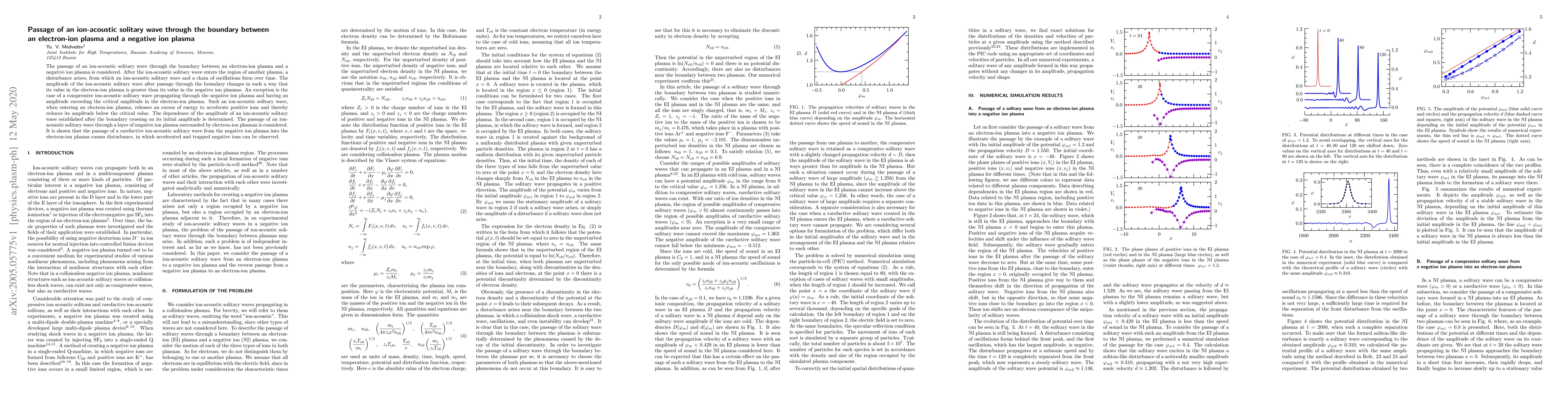 The passage of an ion-acoustic solitary wave through the boundary between an electron-ion plasma and a negative ion plasma is considered. After the ion-acoustic solitary wave enters the region of another plasma, a disturbance arises, from which an ion-acoustic solitary wave and a chain of oscillations form over time. The amplitude of the ion-acoustic solitary wave after passage through the boundary changes in such a way that its value in the electron-ion plasma is greater than its value in the negative ion plasmas. An exception is the case of a compressive ion-acoustic solitary wave propagating through the negative ion plasma and having an amplitude exceeding the critical amplitude in the electron-ion plasma. Such an ion-acoustic solitary wave, when entering an electron-ion plasma, releases an excess of energy to accelerate positive ions and thereby reduces its amplitude below the critical value. The dependence of the amplitude of an ion-acoustic solitary wave established after the boundary crossing on its initial amplitude is determined. The passage of an ion-acoustic solitary wave through a layer of negative ion plasma surrounded by electron-ion plasmas is considered. It is shown that the passage of a rarefactive ion-acoustic solitary wave from the negative ion plasma into the electron-ion plasma causes disturbance, in which accelerated and trapped negative ions can be observed.