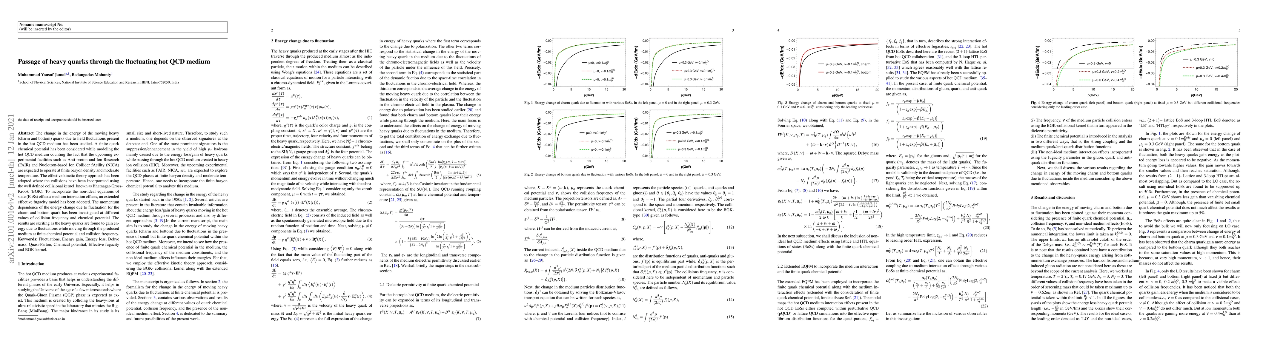 The change in the energy of the moving heavy (charm and bottom) quarks due to field fluctuations present in the hot QCD medium has been studied. A finite quark chemical potential has been considered while modeling the hot QCD medium counting the fact that the upcoming experimental facilities such as Anti-proton and Ion Research (FAIR) and Nuclotron-based Ion Collider fAcility (NICA) are expected to operate at finite baryon density and moderate temperature. The effective kinetic theory approach has been adopted where the collisions have been incorporated using the well defined collisional kernel, known as Bhatnagar-Gross-Krook (BGK). To incorporate the non-ideal equations of state (EoSs) effects/ medium interaction effects, an extended effective fugacity model has been adopted. The momentum dependence of the energy change due to fluctuation for the charm and bottom quark has been investigated at different values of collision frequency and chemical potential. The results are exciting as the heavy quarks are found to gain energy due to fluctuations while moving through the produced medium at finite chemical potential and collision frequency.