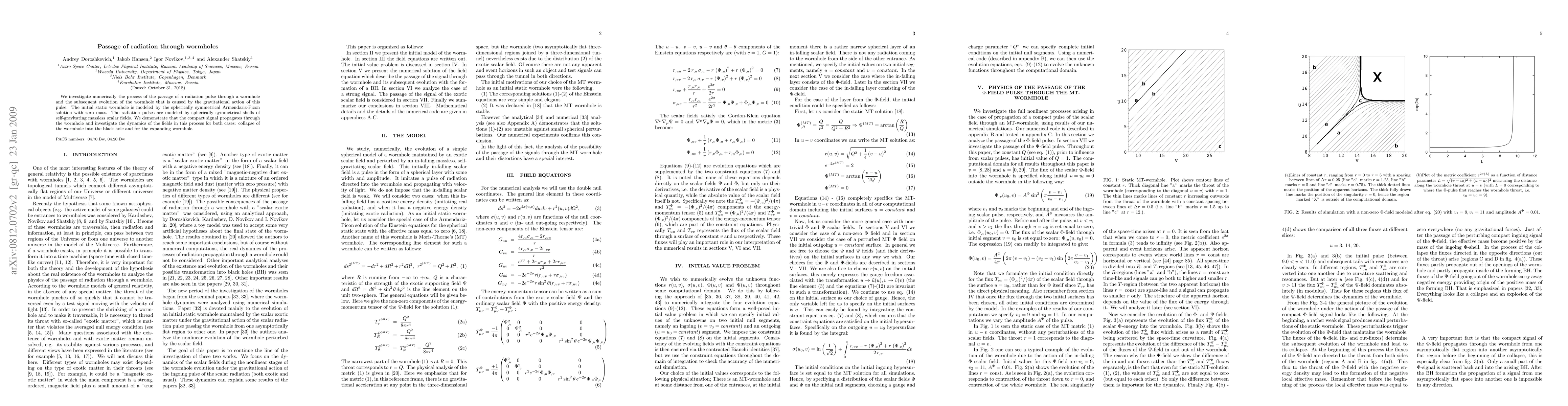We investigate numerically the process of the passage of a radiation pulse through a wormhole and the subsequent evolution of the wormhole that is caused by the gravitational action of this pulse. The initial static wormhole is modeled by the spherically symmetrical Armendariz-Picon solution with zero mass. The radiation pulses are modeled by spherically symmetrical shells of self-gravitating massless scalar fields. We demonstrate that the compact signal propagates through the wormhole and investigate the dynamics of the fields in this process for both cases: collapse of the wormhole into the black hole and for the expanding wormhole.